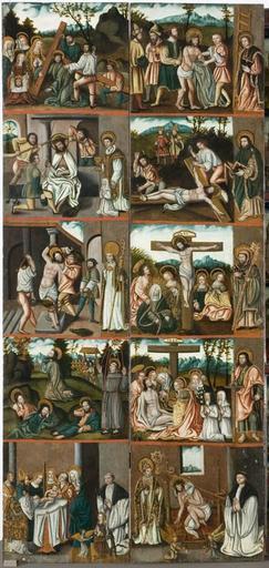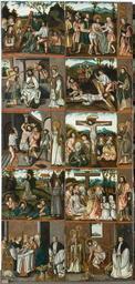 Keywords: MCC-42054 Veelluik met het martelaarschap van de H. Theodosia (2).jpg Artwork nl Anonymous Gelre nl Middenstuk 1 Theodosia verzoekt toelating tot de gevangenis Rechtsboven een engel met banderol waarop de tekst Ghi sijt verhoert die geve die ghi do bidt heb ick gevestigt mit mijnen gelt die martelie te liden 2 Theodosia wordt bij de magistraat ter verantwoording geroepen Op het tekstbord Desen s alch sal ick mitter hulpen des heren voer s en 3 Theodosia ™s marteling aan de hefboom Op het tekstbord Ic ben bereyd dinc voer iezus christo te liden 4a Theodosia aan de schandpaal 4b Theodosia ™s ledematen worden uitgerekt 5 Allegorische voorstelling Christus aan het kruis met het offerlam op zijn schouders; onder het kruis negen schapen Op de voorgrond links een non rechts koning David met een gouden kroon op zijn hoofd en een herdersstaf met schep in beide handen die hij naar de non uitsteekt; tussen hen in ligt een harp Op het tekstbord suster hoede die scapen dier gedacten in die minne des brudegoms iesus opten berch caluarie 6a Theodosia uit het water gered door twee engelen 6b Vijf nonnen en een vrouw in wereldse kledij bezoeken Theodosia in de gevangenis Op het tekstbord min medes elen in cro Christo den enge w ech Het opschrift op de lijst onder de voorstelling is onleesbaar 7 Theodosia voor de wilde dieren geworpen Op het tekstbord nu suldi bekennen hoe vol si vermogen die god mit pueren herten minnen 8 Onthoofding van Theodosia Op het tekstbord dat ic inren tiit des vreden heb vercregen dat sal ic inden striit nie verliesen 9a Verschijning van Theodosia aan haar ouders Op het tekstbord sieh hoe soet die glorie ist daer du mi af beroeven wolste 9b Begrafenis van Theodosia Een zwevende engel met banderol waarop si heft nu salighe vrocht Aan weerszijden van deze taferelen zijn vrouwelijke heiligen afgebeeld steeds twee aan twee met tussen hen in een geknielde non Op de eerste voorstelling links in plaats van een vrouwelijke heilige Maria met kind Links 10a Madonna op de maansikkel en Fides Opschriften / fides 10b Caritas en Spes Opschriften niet leesbaar 11a Agatha en Dorothea Opschriften aghata / doratea 11b Apollonia met attribuut van Agatha tang waarin in plaats van een tand een borst is geklemd en Euphrosia Opschriften appolonia / effrosia 12a Anatolia en Christina Opschriften anatolia / 12b Victoria en Sophia Opschriften victoria / sophia Rechts 13a Margaretha en Gertrudis Opschriften a gretha / gertrudis 13b Ursula en Walburga Opschriften ursula / 14a Catharina en Barbara Opschriften katrina / barbara 14b Agnes en Prisca Opschriften agneta / priska 15a Cecilia en Cunera Opschriften cecilia / cunera 15b Lucia en Clara Opschriften lucia / clara Binnenzijde linkerluiken 16 Kruisdraging met Veronica en Simon van Cyrene 17 Doornenkroning Rechts een als priester geklede heilige met een kelk in de hand en een knielende non 18 Geseling Rechts een H Bisschop 19 Christus in de Hof van Olijven en de stigmatisatie van de Franciscus 20 Besnijdenis Rechts een reguliere kanunnik en een geknielde vrouw in 16de-eeuwse kledij met de attributen van de H Goedele een lantaarn geflankeerd door een engel met een brandende kaars en een duivel met een blaasbalg; daaronder het opschrift gudila 21 Ontkleding van Christus Rechts een heilige met een boek en een ladder 22 Kruisnageling Rechts de apostel Thomas 23 Christus aan het kruis met Maria Johannes en de drie vrouwen Rechts Antonius 24 Bewening Rechts de apostel Paulus en twee geknielde nonnen 25 Christus treedt de wijnpers Links Augustinus rechts een reguliere kanunnik Binnenzijde rechterluiken 26 Aanbidding der koningen 27 Geboorte van Christus Opschrift gloria in excelsis 28a Visitatie 28b Vier nonnen knielend voor een altaar waarop een drieluik met de Kruisiging Achter hen een priester Boven diens hoofd h ia Rechts daarvan een banderol met eenregelige tekst van een lied adv i g i I Fi Filius dn domini 29 Annunciatie Opschrift ave gratia plena 30 Genadestoel Rechtsonder op de voorgrond knielt een non Op het tekstbord god die alle creatueren gescapen heft en ons mit sin dierbaren bloet verlost heft hi wil ock sin gracie geuen ge eit v an der oude naam van de stichtster-non 31 Christus verschijnt aan Maria 32 Hemelvaart van Christus 33 Kroning van Maria 34 Allegorische voorstelling God de Vader gezeten op een troon met op de trappen die naar de troon voeren links de vijf wijze rechts de vijf dwaze maagden; in het midden een engel boven de hellemond met drie verdoemden Op de banderol in de linkerhand van de engel Gae t of Myt ghi vermadi vermaledijden ; op de banderol in zijn rechterhand coemt ghi gebenedide Op het tekstbord bij de wijze maagden gaet tot der gene daer se te coop is Op het tekstbord bij de dwaze maagden geft ons den olie vor ons lamp Op de banderol aan de onderzijde van de voorstelling rick der hemelen sal worden all fiere maechden Buitenzijde linkerluiken Nr 35 36 en 40 t/m 44 zijn gewijd aan de zeven vallen van Christus De voorstellingen zijn zeer verwant aan zeven houtsneden met dit thema gedrukt op één blad getiteld ˜O mensch betracht dy siben vell Christi und dy siben herzenlaydt Marie ™ Wenen Albertina inv nr 1930-70 Zuid-Duitsland ca 1480; zie Marrow 1979 p 82 89 100 106 131 170 pl VIII 35 Christus ™ val voor de kruisnageling zesde val 36 Kruisoprichting zevende val 37 Allegorische voorstelling Christus als Man van Smarten en gebonden aan de geselpaal houdt een rood koord vast dat verbonden is met een knielende non Tekstrol Christus o dochter vollighet my want ic gepassijt bin voor di wilt mij u hert geven om ewich te leuen Tekstrol non here ic offer u myn hert nu ende inder ewicheit Achter de non zeven kleinere opschriften verwijzend naar zeven deugden elk voorafgegaan door een hand met een geselroede waarvan de eerste en de derde onleesbaar zijn 2 die mel it mildheid ; 4 gehoorsamheijt; 5 wakinge; 6 silencia ; 7 arheyt waarheid 38 Allegorische voorstelling In een ommuurde tuin slaat Christus met een hamer op e