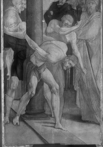| Keywords: MCC-42330 Drieluik met Kruisiging met meerdere figuren (23).jpg  Artwork nl Jan van Scorel nl Op het middenpaneel is op een rotsachtig plateau het kruis weergegeven waaraan Christus is genageld Christus wordt geflankeerd door de twee moordenaars van wie de kruizen naar hem staan toegewend Rondom hem zweven rouwende engelen Maria Magdalena knielt aan de voet van het kruis en links wordt Maria ondersteund door Johannes Rond het kruis van Christus staan verder nog twee vrouwen en een rouwend paar Achter de kruisen zijn verschillende ruiters en een menigte soldaten afgebeeld Onder hen de soldaat met de lans en spons Rechts vechten soldaten om het kleed van Christus In het bergachtige landschap is links Jeruzalem te zien De gebouwen zijn voor een deel geïnspireerd op de architectuur in Rome Links in de verte is de zuil van Trajanus te onderscheiden Rechts in het stadsbeeld de piramide van Sestius Het rotsachtige berglandschap loopt door op de beide zijluiken Het linker luik toont de kruisdraging Christus wordt geholpen door Simon van Cyrene Een soldaat duwt hem de doornenkroon op het hoofd Christus richt zijn blik op de beschouwer Op het middenplan twee ruiters en op de achtergrond Jeruzalem Op het rechter luik is de verrezen Christus afgebeeld Hij staat met de kruisvaan op het geopende graf en wordt omgeven door een mandorla Op de voorgrond twee slapende soldaten Links van de grafopening twee wegrennende soldaten De achterkant van het linker zijluik toont Christus geknield in de Hof van Olijven Boven hem zweeft een engel met een kelk in zijn hand Links op de voorgrond drie slapende discipelen waaronder Petrus met zijn zwaard Rechts knielen twee Karthuizer monniken Hun blik is naar rechts gericht Rechts van de boom Judas die de hem achteropkomende soldaten wijst op Christus Op de buitenkant van het rechter zijluik staat Christus vastgebonden aan een zuil in een galerij Hij wordt gegeseld door twee beulsknechten De rechter trekt Christus' hoofd aan de haren naar beneden Rondom kijken verschillende mannen 'farizeeën' toe Via de van een cassettenplafond voorziene poort is er zicht op een trap met bovenaan drie figuren Rechts op de achtergrond een gebouw between 1530 1539 nl olieverf paneel nl Hoogte 130 0cm Breedte 116 0cm Hoogte 159 0cm Breedte 146 5cm Hoogte 130 0cm Breedte 48 0cm Hoogte 158 0cm Breedte 73 0cm Max hoogte 164 0cm Max breedte 146 5cm Max diepte 13 5cm Institution Museum Catharijneconvent object history exhibition history credit line nl Foto Museum Catharijneconvent Utrecht foto Ruben de Heer Reproduction title nl Digitale IRR-montage van de onderhelft van het rechter buitenluik RKD De ondertekening aangebracht met zwart krijt bestaat uit contourlijnen en een uitgebreid systeem van arceringen voor schaduw en volume De vlotte manier van ondertekenen is typerend voor Jan van Scorel De positie van de hoofden van de twee beulen zijn in de ondertekening heel anders dan in verf accession number Object number 42330 Inventory number ABM s00331 place of creation https //www catharijneconvent nl/adlib/42330/ View this work on the website of Museum Catharijneconvent Museum Catharijneconvent Cc-zero <gallery> File MCC-42330_Drieluik_met_Kruisiging_met_meerdere_figuren_ 23 jpg File MCC-42330_Drieluik_met_Kruisiging_met_meerdere_figuren_ 16 jpg File MCC-42330_Drieluik_met_Kruisiging_met_meerdere_figuren_ 3 jpg File MCC-42330_Drieluik_met_Kruisiging_met_meerdere_figuren_ 4 jpg File MCC-42330_Drieluik_met_Kruisiging_met_meerdere_figuren_ 28 jpg File MCC-42330_Drieluik_met_Kruisiging_met_meerdere_figuren_ 17 jpg File MCC-42330_Drieluik_met_Kruisiging_met_meerdere_figuren_ 26 jpg File MCC-42330_Drieluik_met_Kruisiging_met_meerdere_figuren_ 9 jpg File MCC-42330_Drieluik_met_Kruisiging_met_meerdere_figuren_ 2 jpg File MCC-42330_Drieluik_met_Kruisiging_met_meerdere_figuren_ 1 jpg File MCC-42330_Drieluik_met_Kruisiging_met_meerdere_figuren_ 21 jpg File MCC-42330_Drieluik_met_Kruisiging_met_meerdere_figuren_ 7 jpg File MCC-42330_Drieluik_met_Kruisiging_met_meerdere_figuren_ 24 jpg File MCC-42330_Drieluik_met_Kruisiging_met_meerdere_figuren_ 20 jpg File MCC-42330_Drieluik_met_Kruisiging_met_meerdere_figuren_ 8 jpg File MCC-42330_Drieluik_met_Kruisiging_met_meerdere_figuren_ 27 jpg File MCC-42330_Drieluik_met_Kruisiging_met_meerdere_figuren_ 6 jpg File MCC-42330_Drieluik_met_Kruisiging_met_meerdere_figuren_ 11 jpg File MCC-42330_Drieluik_met_Kruisiging_met_meerdere_figuren_ 18 jpg File MCC-42330_Drieluik_met_Kruisiging_met_meerdere_figuren_ 5 jpg File MCC-42330_Drieluik_met_Kruisiging_met_meerdere_figuren_ 22 jpg File MCC-42330_Drieluik_met_Kruisiging_met_meerdere_figuren_ 12 jpg File MCC-42330_Drieluik_met_Kruisiging_met_meerdere_figuren_ 14 jpg File MCC-42330_Drieluik_met_Kruisiging_met_meerdere_figuren_ 19 jpg File MCC-42330_Drieluik_met_Kruisiging_met_meerdere_figuren_ 13 jpg File MCC-42330_Drieluik_met_Kruisiging_met_meerdere_figuren_ 15 jpg File MCC-42330_Drieluik_met_Kruisiging_met_meerdere_figuren_ 10 jpg File MCC-42330_Drieluik_met_Kruisiging_met_meerdere_figuren_ 25 jpg </gallery> Drieluik met kruisiging |