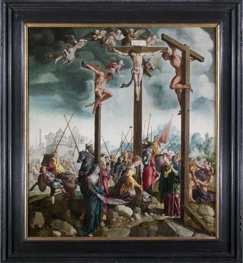 | Keywords: MCC-42330 Drieluik met Kruisiging met meerdere figuren (2).jpg  Artwork nl Jan van Scorel nl Op het middenpaneel is op een rotsachtig plateau het kruis weergegeven waaraan Christus is genageld Christus wordt geflankeerd door de twee moordenaars van wie de kruizen naar hem staan toegewend Rondom hem zweven rouwende engelen Maria Magdalena knielt aan de voet van het kruis en links wordt Maria ondersteund door Johannes Rond het kruis van Christus staan verder nog twee vrouwen en een rouwend paar Achter de kruisen zijn verschillende ruiters en een menigte soldaten afgebeeld Onder hen de soldaat met de lans en spons Rechts vechten soldaten om het kleed van Christus In het bergachtige landschap is links Jeruzalem te zien De gebouwen zijn voor een deel geïnspireerd op de architectuur in Rome Links in de verte is de zuil van Trajanus te onderscheiden Rechts in het stadsbeeld de piramide van Sestius Het rotsachtige berglandschap loopt door op de beide zijluiken Het linker luik toont de kruisdraging Christus wordt geholpen door Simon van Cyrene Een soldaat duwt hem de doornenkroon op het hoofd Christus richt zijn blik op de beschouwer Op het middenplan twee ruiters en op de achtergrond Jeruzalem Op het rechter luik is de verrezen Christus afgebeeld Hij staat met de kruisvaan op het geopende graf en wordt omgeven door een mandorla Op de voorgrond twee slapende soldaten Links van de grafopening twee wegrennende soldaten De achterkant van het linker zijluik toont Christus geknield in de Hof van Olijven Boven hem zweeft een engel met een kelk in zijn hand Links op de voorgrond drie slapende discipelen waaronder Petrus met zijn zwaard Rechts knielen twee Karthuizer monniken Hun blik is naar rechts gericht Rechts van de boom Judas die de hem achteropkomende soldaten wijst op Christus Op de buitenkant van het rechter zijluik staat Christus vastgebonden aan een zuil in een galerij Hij wordt gegeseld door twee beulsknechten De rechter trekt Christus' hoofd aan de haren naar beneden Rondom kijken verschillende mannen 'farizeeën' toe Via de van een cassettenplafond voorziene poort is er zicht op een trap met bovenaan drie figuren Rechts op de achtergrond een gebouw between 1530 1539 nl olieverf paneel nl Hoogte 130 0cm Breedte 116 0cm Hoogte 159 0cm Breedte 146 5cm Hoogte 130 0cm Breedte 48 0cm Hoogte 158 0cm Breedte 73 0cm Max hoogte 164 0cm Max breedte 146 5cm Max diepte 13 5cm Institution Museum Catharijneconvent object history exhibition history credit line nl Foto Museum Catharijneconvent Utrecht foto Ruben de Heer Reproduction title nl Middenpaneel na restauratie Van der Elst 2008 accession number Object number 42330 Inventory number ABM s00331 place of creation https //www catharijneconvent nl/adlib/42330/ View this work on the website of Museum Catharijneconvent Museum Catharijneconvent Cc-zero <gallery> File MCC-42330_Drieluik_met_Kruisiging_met_meerdere_figuren_ 23 jpg File MCC-42330_Drieluik_met_Kruisiging_met_meerdere_figuren_ 16 jpg File MCC-42330_Drieluik_met_Kruisiging_met_meerdere_figuren_ 3 jpg File MCC-42330_Drieluik_met_Kruisiging_met_meerdere_figuren_ 4 jpg File MCC-42330_Drieluik_met_Kruisiging_met_meerdere_figuren_ 28 jpg File MCC-42330_Drieluik_met_Kruisiging_met_meerdere_figuren_ 17 jpg File MCC-42330_Drieluik_met_Kruisiging_met_meerdere_figuren_ 26 jpg File MCC-42330_Drieluik_met_Kruisiging_met_meerdere_figuren_ 9 jpg File MCC-42330_Drieluik_met_Kruisiging_met_meerdere_figuren_ 2 jpg File MCC-42330_Drieluik_met_Kruisiging_met_meerdere_figuren_ 1 jpg File MCC-42330_Drieluik_met_Kruisiging_met_meerdere_figuren_ 21 jpg File MCC-42330_Drieluik_met_Kruisiging_met_meerdere_figuren_ 7 jpg File MCC-42330_Drieluik_met_Kruisiging_met_meerdere_figuren_ 24 jpg File MCC-42330_Drieluik_met_Kruisiging_met_meerdere_figuren_ 20 jpg File MCC-42330_Drieluik_met_Kruisiging_met_meerdere_figuren_ 8 jpg File MCC-42330_Drieluik_met_Kruisiging_met_meerdere_figuren_ 27 jpg File MCC-42330_Drieluik_met_Kruisiging_met_meerdere_figuren_ 6 jpg File MCC-42330_Drieluik_met_Kruisiging_met_meerdere_figuren_ 11 jpg File MCC-42330_Drieluik_met_Kruisiging_met_meerdere_figuren_ 18 jpg File MCC-42330_Drieluik_met_Kruisiging_met_meerdere_figuren_ 5 jpg File MCC-42330_Drieluik_met_Kruisiging_met_meerdere_figuren_ 22 jpg File MCC-42330_Drieluik_met_Kruisiging_met_meerdere_figuren_ 12 jpg File MCC-42330_Drieluik_met_Kruisiging_met_meerdere_figuren_ 14 jpg File MCC-42330_Drieluik_met_Kruisiging_met_meerdere_figuren_ 19 jpg File MCC-42330_Drieluik_met_Kruisiging_met_meerdere_figuren_ 13 jpg File MCC-42330_Drieluik_met_Kruisiging_met_meerdere_figuren_ 15 jpg File MCC-42330_Drieluik_met_Kruisiging_met_meerdere_figuren_ 10 jpg File MCC-42330_Drieluik_met_Kruisiging_met_meerdere_figuren_ 25 jpg </gallery> Drieluik met kruisiging |