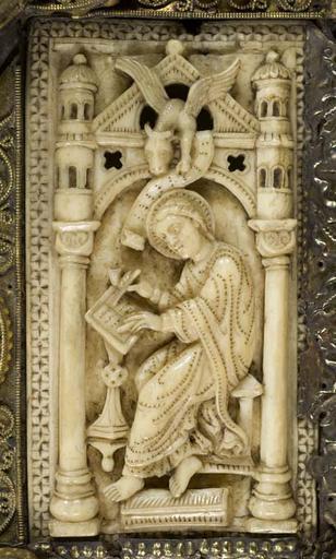 Keywords: MCC-61050 Evangeliarium (Lebuïnuscodex) (337).jpg Artwork nl Anonymous Noordoost-Frankrijk Anonymous Rijnland Anonymous Maasland nl De kern van de boekband van de Lebuïnuscodex wordt gevormd door twee eikenhouten platten De rug en het achterplat zijn overtrokken met zeemleer Het voorplat is rijkelijk versierd met verguld zilversmeedwerk reliëfs van walrustand en verscheidene stenen De compositie van de bekleding van het voorplat wordt bepaald door een verguld zilveren filigraankruis Aan de uiteinden van de kruisarmen bevinden zich vierpassen met overhoeks vierkant eveneens met filigraan gedecoreerd Hiervan zijn er slechts twee bewaard gebleven en wel die aan de verticale kruisarmen Zij bevatten tevens nog de oorspronkelijke versiering bestaande uit een filigraanmedaillon met een pseudo-camee van respectievelijk een mannen- en een vrouwenhoofd in profiel Het snijpunt van het kruis wordt ingenomen door een ver vooruitstekend Bacchuskopje in chalcedoon te herkennen aan de kleine druiventrosjes in zijn haartooi Het kopje is gevat in een filigraanmedaillon welke op zijn beurt weer is geplaatst op een vierpas van filigraanwerk Op elk van de kruisarmen bevindt zich een ovale steen 'en cabochon' op een medaillon met filigraan Het filigraanwerk van kruis en sierstukken is in de vorm van visblazen In de ruimten tussen de kruisarmen zijn rechthoekige reliëfs van walrustand aangebracht met de vier evangelisten en hun symbool De reliëfs hebben de volgende afmetingen H 10 0 x B 5 5 cm Van links boven naar rechts onder betreft het Mattheus met de engel Johannes met de adelaar Marcus met de gevleugelde leeuw en Lucas met de gevleugelde os De figuren zijn paarsgewijs als elkaars spiegelbeeld ten opzichte van de middenas geplaatst Mattheus en Johannes zitten vrijwel geheel frontaal terwijl Marcus en Lucas meer in profiel zijn afgebeeld Qua opbouw verschillen de vier reliëfs nauwelijks van elkaar Binnen een rand van vierlobbige blaadjes verheffen zich twee zuilen met een basis een kapiteel en een dekplaat Hierop rust een rondboog geflankeerd door twee torens en afgedekt met een fronton dat boven Mattheus en Johannes boogvormig en boven Marcus en Lucas driehoekig is Onder deze overhuiving zitten de evangelisten gekleed in een lang gewaad en mantel met gekruiste benen aan een lessenaar hun blote voeten rustend op een bankje Allen zijn baardeloos en voorzien van een nimbus Voorts houden ze een pen in hun rechterhand terwijl hun linker op een boek ligt of gebarend is opgeheven Boven elk van de evangelisten verschijnt in de opening van het fronton zijn symbool met een spreukband Dit rijkelijk gedecoreerde middenveld wordt omlijst door sierbanden van verguld koper De opbouw van de sierlijsten is steeds dezelfde een opstaande smalle band die op regelmatige afstanden is voorzien van holten met aan weerszijden een brede strook voorzien van een gestanst motief Aan de lange zijden van de boekband bestaat het motief uit palmetten aan de korte zijden uit rozetten Van deze laatstgenoemde stroken ontbreekt steeds de buitenste rand Bij alle stroken met palmettenmotief wijzen de palmetten naar links met uitzondering van de buitenste strook rechtsboven die het motief in tegengestelde richting toont Verguld zilveren rozetten op de hoeken van het voorplat omgeven door een smalle rand van filigraanwerk met cirkelmotief en bekroond met een 'en cabochon' gezette steen completeren het geheel Van de rozet links onder ontbreekt de steen en is slechts de buitenste rand over Aan de voorzijde van de boekband bevinden zich nog de rudimenten van twee sluitingen between u'825' u'1000' u'1150' u'850' u'1199' u'1199' nl perkament eikenhout zilver goud koper walrustand chalcedoon glas leer Size 35 5 26 0 cm nl Hoogte 35 5cm Breedte 26 0cm Diepte 13 5cm Institution Museum Catharijneconvent object history exhibition history credit line nl Foto Museum Catharijneconvent Utrecht foto HetFotoAtelier Peter Rothengatter Reproduction title nl Boekband voorzijde evangelist accession number Object number 61050 Inventory number ABM h1 place of creation https //www catharijneconvent nl/adlib/61050/ View this work on the website of Museum Catharijneconvent Museum Catharijneconvent Cc-zero <gallery> File MCC-61050_Evangeliarium_Lebuïnuscodex_ 11 jpg File MCC-61050_Evangeliarium_Lebuïnuscodex_ 172 jpg File MCC-61050_Evangeliarium_Lebuïnuscodex_ 212 jpg File MCC-61050_Evangeliarium_Lebuïnuscodex_ 61 jpg File MCC-61050_Evangeliarium_Lebuïnuscodex_ 12 jpg File MCC-61050_Evangeliarium_Lebuïnuscodex_ 213 jpg File MCC-61050_Evangeliarium_Lebuïnuscodex_ 56 jpg File MCC-61050_Evangeliarium_Lebuïnuscodex_ 232 jpg File MCC-61050_Evangeliarium_Lebuïnuscodex_ 93 jpg File MCC-61050_Evangeliarium_Lebuïnuscodex_ 99 jpg File MCC-61050_Evangeliarium_Lebuïnuscodex_ 184 jpg File MCC-61050_Evangeliarium_Lebuïnuscodex_ 64 jpg File MCC-61050_Evangeliarium_Lebuïnuscodex_ 299 jpg File MCC-61050_Evangeliarium_Lebuïnuscodex_ 86 jpg File MCC-61050_Evangeliarium_Lebuïnuscodex_ 260 jpg File MCC-61050_Evangeliarium_Lebuïnuscodex_ 159 jpg File MCC-61050_Evangeliarium_Lebuïnuscodex_ 247 jpg File MCC-61050_Evangeliarium_Lebuïnuscodex_ 180 jpg File MCC-61050_Evangeliarium_Lebuïnuscodex_ 121 jpg File MCC-61050_Evangeliarium_Lebuïnuscodex_ 315 jpg File MCC-61050_Evangeliarium_Lebuïnuscodex_ 284 jpg File MCC-61050_Evangeliarium_Lebuïnuscodex_ 33 jpg File MCC-61050_Evangeliarium_Lebuïnuscodex_ 44 jpg File MCC-61050_Evangeliarium_Lebuïnuscodex_ 258 jpg File MCC-61050_Evangeliarium_Lebuïnuscodex_ 237 jpg File MCC-61050_Evangeliarium_Lebuïnuscodex_ 20 jpg File MCC-61050_Evangeliarium_Lebuïnuscodex_ 220 jpg File MCC-61050_Evangeliarium_Lebuïnuscodex_ 279 jpg File MCC-61050_Evangeliarium_Lebuïnuscodex_ 183 jpg File MCC-61050_Evangeliarium_Lebuïnuscodex_ 60 jpg File MCC-61050_Evangeliarium_Lebuïnuscodex_ 166 jpg File MCC-61050_Evangeliarium_Lebuïnuscodex_ 97 jpg File MCC-61050_Evangeliarium_Lebuïnuscodex_ 71 jpg File MCC-61050_Evangeliarium_Lebuïnusc