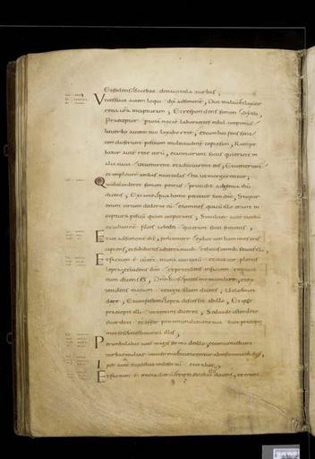 | Keywords: MCC-61050 Evangeliarium (Lebuïnuscodex) (157).jpg Artwork nl Anonymous Noordoost-Frankrijk Anonymous Rijnland Anonymous Maasland nl De kern van de boekband van de Lebuïnuscodex wordt gevormd door twee eikenhouten platten De rug en het achterplat zijn overtrokken met zeemleer Het voorplat is rijkelijk versierd met verguld zilversmeedwerk reliëfs van walrustand en verscheidene stenen De compositie van de bekleding van het voorplat wordt bepaald door een verguld zilveren filigraankruis Aan de uiteinden van de kruisarmen bevinden zich vierpassen met overhoeks vierkant eveneens met filigraan gedecoreerd Hiervan zijn er slechts twee bewaard gebleven en wel die aan de verticale kruisarmen Zij bevatten tevens nog de oorspronkelijke versiering bestaande uit een filigraanmedaillon met een pseudo-camee van respectievelijk een mannen- en een vrouwenhoofd in profiel Het snijpunt van het kruis wordt ingenomen door een ver vooruitstekend Bacchuskopje in chalcedoon te herkennen aan de kleine druiventrosjes in zijn haartooi Het kopje is gevat in een filigraanmedaillon welke op zijn beurt weer is geplaatst op een vierpas van filigraanwerk Op elk van de kruisarmen bevindt zich een ovale steen 'en cabochon' op een medaillon met filigraan Het filigraanwerk van kruis en sierstukken is in de vorm van visblazen In de ruimten tussen de kruisarmen zijn rechthoekige reliëfs van walrustand aangebracht met de vier evangelisten en hun symbool De reliëfs hebben de volgende afmetingen H 10 0 x B 5 5 cm Van links boven naar rechts onder betreft het Mattheus met de engel Johannes met de adelaar Marcus met de gevleugelde leeuw en Lucas met de gevleugelde os De figuren zijn paarsgewijs als elkaars spiegelbeeld ten opzichte van de middenas geplaatst Mattheus en Johannes zitten vrijwel geheel frontaal terwijl Marcus en Lucas meer in profiel zijn afgebeeld Qua opbouw verschillen de vier reliëfs nauwelijks van elkaar Binnen een rand van vierlobbige blaadjes verheffen zich twee zuilen met een basis een kapiteel en een dekplaat Hierop rust een rondboog geflankeerd door twee torens en afgedekt met een fronton dat boven Mattheus en Johannes boogvormig en boven Marcus en Lucas driehoekig is Onder deze overhuiving zitten de evangelisten gekleed in een lang gewaad en mantel met gekruiste benen aan een lessenaar hun blote voeten rustend op een bankje Allen zijn baardeloos en voorzien van een nimbus Voorts houden ze een pen in hun rechterhand terwijl hun linker op een boek ligt of gebarend is opgeheven Boven elk van de evangelisten verschijnt in de opening van het fronton zijn symbool met een spreukband Dit rijkelijk gedecoreerde middenveld wordt omlijst door sierbanden van verguld koper De opbouw van de sierlijsten is steeds dezelfde een opstaande smalle band die op regelmatige afstanden is voorzien van holten met aan weerszijden een brede strook voorzien van een gestanst motief Aan de lange zijden van de boekband bestaat het motief uit palmetten aan de korte zijden uit rozetten Van deze laatstgenoemde stroken ontbreekt steeds de buitenste rand Bij alle stroken met palmettenmotief wijzen de palmetten naar links met uitzondering van de buitenste strook rechtsboven die het motief in tegengestelde richting toont Verguld zilveren rozetten op de hoeken van het voorplat omgeven door een smalle rand van filigraanwerk met cirkelmotief en bekroond met een 'en cabochon' gezette steen completeren het geheel Van de rozet links onder ontbreekt de steen en is slechts de buitenste rand over Aan de voorzijde van de boekband bevinden zich nog de rudimenten van twee sluitingen between u'825' u'1000' u'1150' u'850' u'1199' u'1199' nl perkament eikenhout zilver goud koper walrustand chalcedoon glas leer Size 35 5 26 0 cm nl Hoogte 35 5cm Breedte 26 0cm Diepte 13 5cm Institution Museum Catharijneconvent object history exhibition history credit line nl Foto Museum Catharijneconvent Utrecht foto HetFotoAtelier Peter Rothengatter accession number Object number 61050 Inventory number ABM h1 place of creation https //www catharijneconvent nl/adlib/61050/ View this work on the website of Museum Catharijneconvent Museum Catharijneconvent Cc-zero <gallery> File MCC-61050_Evangeliarium_Lebuïnuscodex_ 11 jpg File MCC-61050_Evangeliarium_Lebuïnuscodex_ 172 jpg File MCC-61050_Evangeliarium_Lebuïnuscodex_ 212 jpg File MCC-61050_Evangeliarium_Lebuïnuscodex_ 61 jpg File MCC-61050_Evangeliarium_Lebuïnuscodex_ 12 jpg File MCC-61050_Evangeliarium_Lebuïnuscodex_ 213 jpg File MCC-61050_Evangeliarium_Lebuïnuscodex_ 56 jpg File MCC-61050_Evangeliarium_Lebuïnuscodex_ 232 jpg File MCC-61050_Evangeliarium_Lebuïnuscodex_ 93 jpg File MCC-61050_Evangeliarium_Lebuïnuscodex_ 99 jpg File MCC-61050_Evangeliarium_Lebuïnuscodex_ 184 jpg File MCC-61050_Evangeliarium_Lebuïnuscodex_ 64 jpg File MCC-61050_Evangeliarium_Lebuïnuscodex_ 299 jpg File MCC-61050_Evangeliarium_Lebuïnuscodex_ 86 jpg File MCC-61050_Evangeliarium_Lebuïnuscodex_ 260 jpg File MCC-61050_Evangeliarium_Lebuïnuscodex_ 159 jpg File MCC-61050_Evangeliarium_Lebuïnuscodex_ 247 jpg File MCC-61050_Evangeliarium_Lebuïnuscodex_ 180 jpg File MCC-61050_Evangeliarium_Lebuïnuscodex_ 121 jpg File MCC-61050_Evangeliarium_Lebuïnuscodex_ 315 jpg File MCC-61050_Evangeliarium_Lebuïnuscodex_ 284 jpg File MCC-61050_Evangeliarium_Lebuïnuscodex_ 33 jpg File MCC-61050_Evangeliarium_Lebuïnuscodex_ 44 jpg File MCC-61050_Evangeliarium_Lebuïnuscodex_ 258 jpg File MCC-61050_Evangeliarium_Lebuïnuscodex_ 237 jpg File MCC-61050_Evangeliarium_Lebuïnuscodex_ 20 jpg File MCC-61050_Evangeliarium_Lebuïnuscodex_ 220 jpg File MCC-61050_Evangeliarium_Lebuïnuscodex_ 279 jpg File MCC-61050_Evangeliarium_Lebuïnuscodex_ 183 jpg File MCC-61050_Evangeliarium_Lebuïnuscodex_ 60 jpg File MCC-61050_Evangeliarium_Lebuïnuscodex_ 166 jpg File MCC-61050_Evangeliarium_Lebuïnuscodex_ 97 jpg File MCC-61050_Evangeliarium_Lebuïnuscodex_ 71 jpg File MCC-61050_Evangeliarium_Lebuïnuscodex_ 132 jpg File MCC-61050_Evangeliarium_Lebuïn