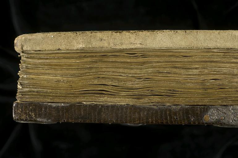 Keywords: MCC-68515 Evangelistarium (Bernulphuscodex) (461).jpg Artwork nl Anonymous Zuid-Duitsland Reichenau OSB nl De kern van de boekband van de Bernulphuscodex wordt gevormd door twee eikenhouten platten De rug en het achterplat zijn overtrokken met zeemleer Het voorplat bestaat uit een enigszins verdiept rechthoekig middenveld omgeven door een brede rand In het middenveld bevindt zich een verguld zilveren filigraankruis met een verhoogd ingezwenkt achtkantig middenstuk en breed uitlopende armen Het filigraanwerk bestaat uit cirkelvormige uitwaaierende ranken met bolletjes aan de uiteinden en in het midden hier en daar kleine rozetjes Op het snijpunt van beide kruisarmen bevindt zich een ovale zwartblauw en grijs gekleurde onyx in de bovenarm een klassiek gesneden vrouwenkop van chalcedoon op de rechterarm een stuk donkerrood glas en beneden een bruin gestreepte agaat De bekleding van de linker kruisarm ontbreekt De lager gelegen velden tussen de kruisarmen zijn bekleed met dunne gouden platen Langs de randen hiervan is een parelrandje gestanst In het midden van de velden bevindt zich een medaillon met email-cloisonné De bovenste twee zijn voorzien van een diagonaal patroon met witte getrapte vierkantjes met rode stip tegen een donkerblauwe achtergrond Op de onderste twee is een stervormig respectievelijk concentrisch patroon aangebracht De aldaar toegepaste kleuren zijn translucide groen opaak wit geel en bruinpaars In de buitenste hoeken van de lager gelegen velden zijn ronde stenen in een vierkante zetting aangebracht Hiervan is slechts de opaal in de rechter bovenhoek bewaard gebleven In de overige hoeken is alleen nog de vierkante uitsparing te zien De brede rand is overtrokken met verguld zilveren stroken met grote rozetten die van elkaar gescheiden zijn door vier kleine stippelroosjes tussen twee evenwijdig lopende parelrandjes Aan de korte zijden van het voorplat ontbreekt de rozettenrand; slechts de spijkers waarmee ze waren vastgemaakt zijn nog te zien Aan de lange zijde ontbreekt een stuk uit de rand en wel links onder het midden Verdeeld over de nog aanwezige rozetten zijn vier alsengemmen en twee zilveren medaillons aangebracht Laatstgenoemde zijn versierd met een gezicht en bladwerk Vier medaillons met de evangelistensymbolen zijn op de hoeken van de brede rand aangebracht van links boven naar rechts onder betreft het de adelaar van Johannes de engel van Mattheus de gevleugelde os van Lucas en de gevleugelde leeuw van Marcus De banderol die de figuren dragen vermeldt de naam van de betreffende evangelist De naam van Marcus staat in spiegelbeeld Het woord Lucas is over andere letters gekrast De armen van het kruis de acht segmenten van het middenstuk alsmede de sierstukken zijn omlijst met een fijn geparelde gouden filigraandraad Techniek nog in te vullen volgens Korteweg zijn de medaillons met symbolen van Marcus en Lucas uit een graveerplaat gezaagd; rozetten in rand gestanst De sierlijst met rozetten is met behulp van kleine spijkertjes op de houten rand bevestigd Staat nog in te vullen Volgens Korteweg 1979 waren de medaillons met de symbolen van Johannes en Mattheus oorspronkelijk geëmailleerd De velden vertonen nog sporen van gekleurd email Volgens Steenbock 1965 waren het juist de medaillons met Lucas en Marcus Volgens Korteweg 1979 is het verguldsel van de stroken met rozetten enigszins afgesleten Onder de linkerzijde van het metaalwerk van het voorplat bevindt zich rode zijde; aan de smalle zijden van het voorplat ontbreken de rozettenranden slechts de spijkers waarmee ze waren vastgemaakt zijn nog te zien Aan de lange zijde links onder het midden ontbreekt een stuk uit de rand Van het chalcedonen vrouwenkopje ontbreekt de neus en is de kin beschadigd between u'1040' u'1200' u'1050' u'1499' nl perkament eikenhout zilver goud chalcedoon onyx glas agaat opaal Size 31 5 24 0 cm nl Hoogte 31 5cm Breedte 24 0cm Diepte 9 8cm Institution Museum Catharijneconvent object history exhibition history credit line nl Foto Museum Catharijneconvent Utrecht foto HetFotoAtelier Peter Rothengatter accession number Object number 68515 Inventory number ABM h3 place of creation https //www catharijneconvent nl/adlib/68515/ View this work on the website of Museum Catharijneconvent Museum Catharijneconvent Cc-zero <gallery> File MCC-68515_Evangelistarium_Bernulphuscodex_ 353 jpg File MCC-68515_Evangelistarium_Bernulphuscodex_ 412 jpg File MCC-68515_Evangelistarium_Bernulphuscodex_ 160 jpg File MCC-68515_Evangelistarium_Bernulphuscodex_ 6 jpg File MCC-68515_Evangelistarium_Bernulphuscodex_ 393 jpg File MCC-68515_Evangelistarium_Bernulphuscodex_ 89 jpg File MCC-68515_Evangelistarium_Bernulphuscodex_ 270 jpg File MCC-68515_Evangelistarium_Bernulphuscodex_ 425 jpg File MCC-68515_Evangelistarium_Bernulphuscodex_ 104 jpg File MCC-68515_Evangelistarium_Bernulphuscodex_ 291 jpg File MCC-68515_Evangelistarium_Bernulphuscodex_ 398 jpg File MCC-68515_Evangelistarium_Bernulphuscodex_ 339 jpg File MCC-68515_Evangelistarium_Bernulphuscodex_ 65 jpg File MCC-68515_Evangelistarium_Bernulphuscodex_ 403 jpg File MCC-68515_Evangelistarium_Bernulphuscodex_ 311 jpg File MCC-68515_Evangelistarium_Bernulphuscodex_ 159 jpg File MCC-68515_Evangelistarium_Bernulphuscodex_ 347 jpg File MCC-68515_Evangelistarium_Bernulphuscodex_ 453 jpg File MCC-68515_Evangelistarium_Bernulphuscodex_ 289 jpg File MCC-68515_Evangelistarium_Bernulphuscodex_ 273 jpg File MCC-68515_Evangelistarium_Bernulphuscodex_ 286 jpg File MCC-68515_Evangelistarium_Bernulphuscodex_ 236 jpg File MCC-68515_Evangelistarium_Bernulphuscodex_ 447 jpg File MCC-68515_Evangelistarium_Bernulphuscodex_ 227 jpg File MCC-68515_Evangelistarium_Bernulphuscodex_ 110 jpg File MCC-68515_Evangelistarium_Bernulphuscodex_ 139 jpg File MCC-68515_Evangelistarium_Bernulphuscodex_ 276 jpg File MCC-68515_Evangelistarium_Bernulphuscodex_ 10 jpg File MCC-68515_Evangelistarium_Bernulphuscodex_ 325 jpg File MCC-68515_Evangelistarium_Bernulphuscodex_ 154 jpg File MCC-68515_Ev