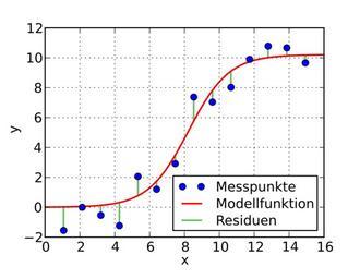 | Keywords: MDKQ1.svg de Fit einer Logistischen Funktion an Messdaten own Neufassung von File LogistischeFunktion png vom Benutzer de User Philipendula Christian Schirm 2011-02-01 Cc-zero Quellen Skript zur Bildgenerierung Erzeugungsskript um die Grafik zu erstellen Anleitung Benötigte Open-Source-Software http //www python org/download Python Python-Paket http //sourceforge net/projects/numpy numpy Python-Paket http //matplotlib sourceforge net matplotlib Nach der Installation von Python den Quelltext in eine Datei mdkq py kopieren und starten durch Doppelklicken oder in der Konsole durch Eingabe von python mdkq py Python-Skript Created with Matplotlib <source lang python > This source code is public domain Author Christian Schirm import numpy pylab from matplotlib font_manager import FontProperties import matplotlib pyplot as plt G 1 k 1 f0 0 5 x numpy linspace -8 8 16 1 -1 numpy random seed 50 y numpy random normal G/ 1+numpy exp -k G x G/f0-1 0 1 numpy random seed int time time err 1E8 err numpy mean numpy square y-G/ 1+numpy exp -k G x G/f0-1 print err G k f0 numpy random seed 2 for i in range 5000 faktor 1+0 01 numpy random rand - 5 for ivar in 1 2 3 backup err G k f0 var backup varivar varivar faktor err G k f0 var err_neu numpy mean numpy square y-G/ 1+numpy exp -k G x G/f0-1 if err_neu<err err err_neu else varivar backupivar err G k f0 var print err G k f0 Fehlerquadrat minimiert xneu numpy linspace -8 8 50 yneu G/ 1+numpy exp -k G xneu G/f0-1 xr x yr G/ 1+numpy exp -k G xr G/f0-1 residuen for i in range len x residuen+ xi+8 xi+8 yi 10 yri 10 'g-' plt clf fig plt figure figsize 4 5 3 5 fig subplotpars bottom 0 15 y0 plt plot residuen -3 plt setp y0 color ' 60c060' linewidth 1 5 y0 plt plot residuen-3 label 'Residuum' plt setp y0 color ' 60c060' linewidth 1 5 y2 plt plot xneu+8 yneu 10 'r-' label 'Modellfunktion' plt setp y2 linewidth 1 5 y1 plt plot x+8 y 10 'o' label 'Messungen' plt xlabel 'x' plt ylabel 'y' font FontProperties font set_size 'medium' leg plt legend y1 y2 y0 'Messpunkte' 'Modellfunktion' 'Residuen' frameon True loc 'lower right' labelspacing 0 3 prop font plt grid True plt show plt savefig 'MDKQ1 svg' </source> Regression analysis Numerical analysis |