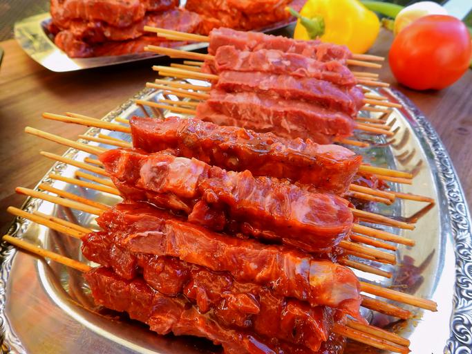 Keywords: meat raw tasty food grill grilled meats frisch eat barbecue prepare marinade marinated vegetables mushroom tomato onion paprika spit