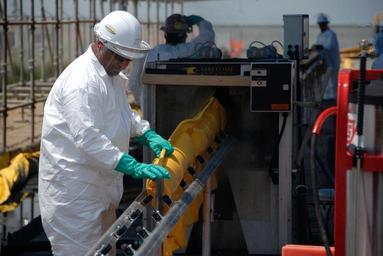 Keywords: Mechanized boom decontamination deepwater horizon.jpg en Mechanized boom decontamination used during the Deepwater Horizon Oil Spill cleanup efforts 2010-08-06 16 22 27 http //www flickr com/photos/niosh/8744744784/ National Institute for Occupational Safety and Health PD-USGov Uploaded with UploadWizard Deepwater Horizon oil spill Protective equipment |