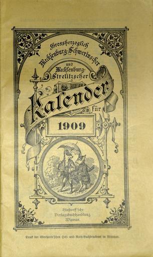 | Keywords: Mecklenburgischer Kalender 1909 000.jpg Großherzoglich Mecklenburg-Schwerinscher und Mecklenburg Strelitzscher Kalender für 1909 Hinstorff'sche Verlagsanstalt Wismar Umschlagseite own photo of item in own collection 1909 anonymous PD-old-100 Mecklenburgischer Kalender 1909 Photos by User AndreasPraefcke |
