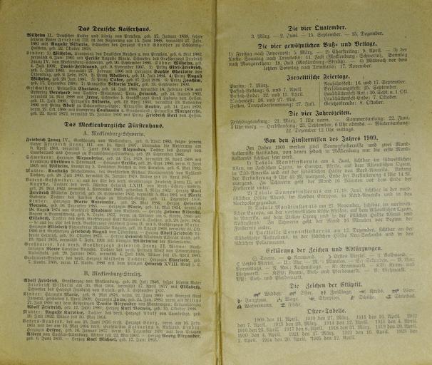 | Keywords: Mecklenburgischer Kalender 1909 002.jpg Großherzoglich Mecklenburg-Schwerinscher und Mecklenburg Strelitzscher Kalender für 1909 Hinstorff'sche Verlagsanstalt Wismar own photo of item in own collection 1909 anonymous PD-old-100 Mecklenburgischer Kalender 1909 Photos by User AndreasPraefcke |