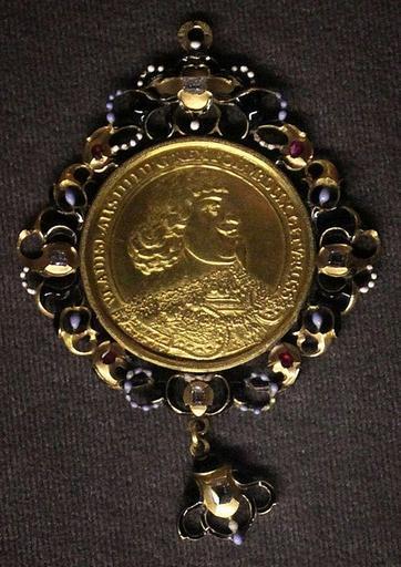 | Keywords: Medal of Władysław IV Vasa.jpg Pendant with medal of Władysław IV Zawieszenie z medalem Władysława IV Gold silver enamel 4 rubies 5 diamonds Kraków Institution Wawel Royal Castle Medal minted in honor of King Władysław IV Inicials on the frame A DIX F of Kraków's goldsmith Adalbert Wojciech Dixon of Aberdeen d 1653 <br> The medals of sovereigns often framed in gold were presented as a special award or replace state awards The practice initiated in Poland by King Sigismund Augustus spread widely at the court of the Vasas Among the recipients were Franciszek Mniszech False Dmitriy I Bartłomiej Nowodworski papal nuncio Claudio Rangoni Muscovy envoy Denis Grigorievich Aladyin april 1613 Duke of Pomerania and the Elector of Brandenburg Object history own BurgererSF 6009 ca 1640 Sebastian Dadler medal Adalbert Dixon frame Copyright expired PD-Art Other versions <gallery>File Mikalojus Kristupas ir Marija Eleonora Chaleckiai jpg</gallery> Cc-zero Sebastian Dadler Adalbert Dixon Crown Treasury of the Wawel Castle Pendants from the Polish Vasa Collection Medals of Poland 1640s medals |