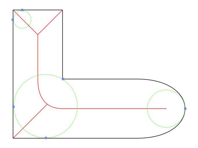 | Keywords: Medial axis example 2d.svg en A simple example of a two-dimensional bordered area in black with its medial axis in red The medial axis consists of line- and parabola-elements Three maximal circles are shown in green with their footpoints in blue on the boundary They belong to different classes 1 the general case with two touching footpoints circle centre lies on a curve; 2 the case with three footpoints circle center is a branching point where curves meet; and 3 the case with one footpoint circle centre is a curvature centre of the boundary de Ein einfaches Beispiel eines zweidimensionalen berandeten Gebietes schwarz mit seiner Medialen Achse rot die aus Geraden- und Parabel-Elementen besteht Es sind drei maximale Kreise grün mit ihren Berührpunkten blau auf dem Rand eingezeichnet Sie gehören zu drei verschiedenen Klassen 1 der allgemeine Fall mit zwei Berührpunkten der Kreismittelpunkt liegt auf einem Kurvenstück; 2 der Fall mit drei Berührpunkten der Kreismittelpunkt ist ein Verzweigungspunkt in dem sich mehrere Kurvenstücke treffen; und 3 der Fall mit einem Berührpunkt der Kreismittelpunkt ist Krümmungszentrum der Randkurve own Pblanke 2010-03-22 Geometry diagrams |