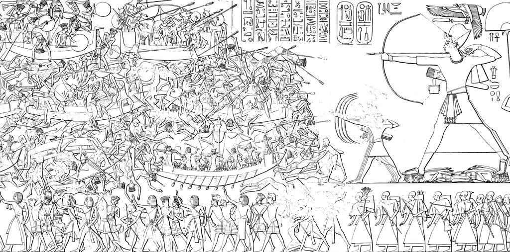 | Keywords: Medinet Habu Ramses III. Tempel Nordostwand Abzeichnung 01.jpg de Umzeichnung des Seevölkerkrieges an der Nordostwand des Totentempels Ramses ™ III in Medinet Habu Ă„gypten Dorothea Gray Seewesen Archaeologia Homerica Band I Kapitel G Göttingen 1974 S 166/167 1200 “1150 B C author PD-old-100 Seevölker jpg Navy of Egypt Ramses III Sea Peoples Northeast wall of Medinet Habu Temple Reliefs in Medinet Habu Temple - details Ancient Egyptian Navy Naval battle of Delta | ||||