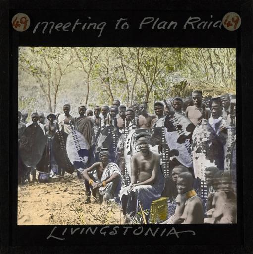 Keywords: "Meeting to Plan Raid, Livingstonia" Malawi, ca.1895 (imp-cswc-GB-237-CSWC47-LS3-1-049).jpg en <br> Meeting to Plan Raid Livingstonia Malawi ca 1895 Photograph of a group of men likely of the Ngoni people The men are gathered in a forest clearing and many carry decorated shields and spears ; The Ngoni people are an ethnic group living in Malawi Mozambique Tanzania and Zambia Their origins can be traced to the Zulu people of kwaZulu-Natal in South Africa Photographer Unknown Filename imp-cswc-GB-237-CSWC47-LS3-1-049 tif Coverage date circa 1895 Part of collection International Mission Photography Archive ca 1860-ca 1960 Type images Part of subcollection Photographs from the Centre for the Study of World Christianity University of Edinburgh U K ca 1900-ca 1940s Repository name Centre for the Study of World Christianity Archival file impaunpub_Volume7/1435 url Repository address The University of Edinburgh School of Divinity New College Mound Place Edinburgh EH1 2LX United Kingdom Geographic subject country Malawi Format aacr2 1 lantern slide 8 x 8 cm Geographic subject continent Africa Rights Contact the repository for details Part of series Elmslie of the Wild Ngoni LS3/1 Repository email divinity-CSWC ed ac uk Subject lcsh Keyword Tribes; Manners and customs Date created circa 1895 Publisher of the digital version University of Southern California Libraries Subject aat genre group portraits Format aat lantern slides Legacy record ID impa-m68445 Access conditions http //www ed ac uk/schools-departments/divinity/research/centres/world-christianity/collections-resources File GB 237 CSWC47/LS3/1/49 1895 author http //digitallibrary usc edu/cdm/ref/collection/p15799coll123/id/64556 PD-old-70-1923 Magic lantern images Images from USC Digital Library uploaded by Fæ International Mission Photography Archive ca 1860-ca 1960 Fur shields Calf clothing Nguni |