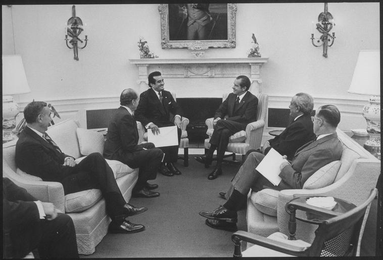 | Keywords: Meeting with Prince Fahd of Sudi Arabia - NARA - 194734.tif Scope and content Pictured Joseph Sisco Camille Nowfel Prince Fahd of Saudi Arabia President Nixon Ibrahim-Al Sowayel Harold Saunders Subject Head of State - Arab General notes 194734 Local identifier NLRN-WHPO-7323-02A General Services Administration National Archives and Records Service Office of Presidential Libraries Office of Presidential Papers 01/20/1969 - ca 12/1974 Most Recent <br /> President 1969-1974 Nixon White House Photo Office 1969 - 1974 Most Recent NARA-Author Kightlinger Jack E 1932-2009 Photographer 8451338 <br /> Richard Nixon Library NLRN 18001 Yorba Linda Boulevard Yorba Linda CA 92886 1971-09-21 Record group Collection RN-WHPO White House Photo Office Collection Nixon Administration 01/20/1969 - 08/09/1974 Record group ARC 1179 Nixon White House Photographs compiled 01/20/1969 - 08/09/1974 documenting the period 08/08/1968 - 08/09/1974 Series ARC 194277 File unit File unit ARC Variant control numbers NAIL Control Number NLNP-WHPO-MPF-7323 02A yes Other versions NARA-cooperation PD-USGov Richard Nixon in 1971 Richard Nixon in the Oval Office Prince Fahd |