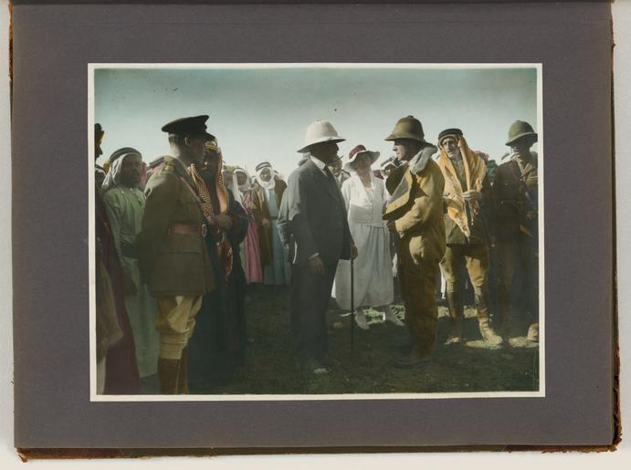 | Keywords: Meetings of British, Arab, and Bedouin officials in Amman, Jordan, April 1921 - File 11.tif en Photographs show meetings between Arab Bedouin and British officials around April 17-27 1921 at Amir Abdullah ibn Hussein's camp at Amman Jordan During these meetings British High Commissioner Herbert Samuel proclaimed Amir Abdullah as the ruler of Transjordan under British protection Among the persons depicted are Amir Abdullah John D Whiting possibly Sheik Sultan of the Belka Sultan ibn 'Ali id Diab ul 'Adwan Amir Shaker bin Zeid future Regent of Transjordan Bedouin chief Auda Abu Tayi Sheik Majid Pasha el Adwan Herbert Samuel British civil administrator Wyndham Deedes British diplomat Albert Abramson T E Lawrence Lawrence of Arabia and possibly Iraq civil administrator Gertrude Bell Also shown are horse racing an airplane landing at Abdullah's camp Circassian leaders Abudullah's bodyguard on camels and Herbert Samuel reading his proclamation of Abdullah as leader of Transjordan Reproduction Number LC-DIG-ppmsca-15304 digital files of original photos LC-DIG-ppmsca-15305 digital files of album pages Rights Advisory No known restrictions on publication Access Advisory For reference access please use the digital images in the online catalog to preserve the fragile original items Notes Photographs were created by the photographers of the American Colony Photo Department located in Jerusalem Founded in the late 1890s by Elijah Meyers the photo agency was headed during its heyday ca 1903-1933 by Lewis Larsson whose staff photographers included Erik Lind Lars Lind Furman Baldwin and G Eric Matson It transitioned into the Matson Photo Service around 1940 with photography by Matson Hanna Safieh Joseph H Giries and others John D Whiting contributed periodically to the work of both agencies The images in this album were probably taken by Lewis Larsson and/or Eric Matson For more information see http //hdl loc gov/loc pnp/pp matpc and http //www loc gov/rr/print/coll/629_whiting html Some caption information for these photographs based on information from matching negatives in the G Eric and Edith Matson Photograph Collection LC-M32-1942 LC-M32-1952 LC-M32-1951 LC-M32-1954 LC-M32-1956 M32-1957 and LC-M32-50280-x Album unpaginated album page numbers supplied by Library staff Pages 1-2 and verso of each page are blank One unattached photograph was found with the album and is stored with it Photograph is a portrait of a Jordanian man in traditional dress Blind stamp Hagop Berberian Amman Stamped on verso Copyright reserved By appointment to H M the King photographers Hagop Berberian Son More information about the events and people depicted in the album are available in the John D Whiting Supplementary Archive Box 1 LOT title devised by Library staff John D Whiting's diaries correspondence and other materials are located in the Library of Congress Manuscript Division Papers of John D Whiting Forms part of Visual materials from the papers of John D Whiting Library of Congress Transfer; Manuscript Division; 2006; DLC/PP-2006 051 29 Subjects Samuel Herbert Louis Samuel --Viscount --1870-1963 Lawrence T E -- Thomas Edward --1888-1935 Abdullah --King of Jordan --1882-1951 Deedes Wyndham Henry --Sir --1883-1956 Shākir ibn Zayd --Prince son of Zayd ibn Fawwāz Amir of Ṭāʾif --1885-1934 Bell Gertrude Lowthian --1868-1926 Jordan--History--1919-1946 American Colony Jerusalem --People--1920-1930 British--Jordan--Amman--1920-1930 Arabs--Jordan--Amman--1920-1930 Bedouins--Jordan--Amman--1920-1930 Circassians--Jordan--Amman--1920-1930 Tribal chiefs--Jordan--Amman--1920-1930 Meetings--Jordan--Amman--1920-1930 Camps--Jordan--Amman--1920-1930 Government officials--Jordan--Amman--1920-1930 Biplanes--Jordan--Amman--1920-1930 Proclamations--Jordan--Amman--1920-1930 April 17-27 1921 http //www loc gov/pictures/item/mpc2010001545/PP/resource/ Whiting John D John David 1882-1951 photographer Larsson Lewis photographer Matson G Eric Gästgifvar Eric 1888-1977 photographer other versions Wikimedia Levant - GLAM PD-Jordan 1921 Herbert Samuel and Amir Abdullah meetings |