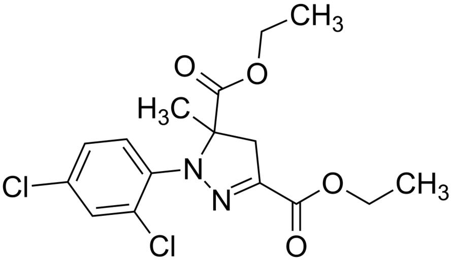 | Keywords: Mefenpyr-diethyl 200.svg validSVG Structure of diethyl 1- 2 4-dichlorophenyl -5-methyl-4 5-dihydro-1H-pyrazole-3 5-dicarboxylate Own 2014-06-08 Emeldir <span class signature-talk ></span> Chemical structure verified https //upload wikimedia org/wikipedia/commons/4/46/Mefenpyr-diethyl_200 svg 1S/C16H18Cl2N2O4/c1-4-23-14 21 12-9-16 3 15 22 24-5-2 20 19-12 13-7-6-10 17 8-11 13 18/h6-8H 4-5 9H2 1-3H3 OPGCOAPTHCZZIW-UHFFFAOYSA-N 135590-91-9 Synonyms <small>1- 2 4-Dichlorophenyl -4 5-dihydro-5-methyl-1H-pyrazole-3 5-dicarboxylic acid diethyl ester Diethyl RS -1- 2 4-dichlorophenyl -5-methyl-2-pyrazoline-3 5-dicarboxylate Mefenpyr-diethyl</small> PD-chem Carboxylate esters Ethyl esters Dichlorobenzenes Pyrazoles Herbicide safener |