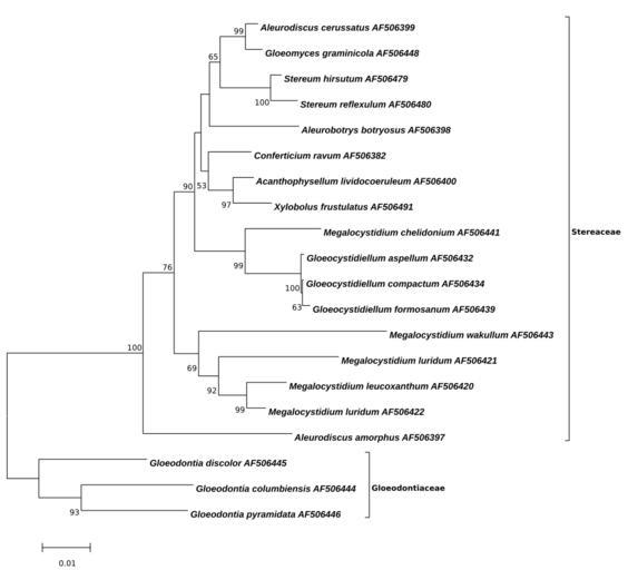 | Keywords: Megalocystidium-Minimum Evolution-Tree.svg Figure Evolutionary relationship of Megalocystidium <br/> The evolutionary history was inferred using the Minimum Evolution method 1 The optimal tree with the sum of branch length 0 36807172 is shown The percentage of replicate trees in which the associated taxa clustered together in the bootstrap test 1000 replicates are shown next to the branches 2 The tree is drawn to scale with branch lengths in the same units as those of the evolutionary distances used to infer the phylogenetic tree The evolutionary distances were computed using the Kimura 2-parameter method 3 and are in the units of the number of base substitutions per site The ME tree was searched using the Close-Neighbor-Interchange CNI algorithm 4 at a search level of 2 The Neighbor-joining algorithm 5 was used to generate the initial tree The analysis involved 20 nucleotide sequences All positions with less than 95 site coverage were eliminated That is fewer than 5 alignment gaps missing data and ambiguous bases were allowed at any position Evolutionary analyses were conducted in http //megasoftware net/ MEGA6 2<br/> 1 Rzhetsky A and Nei M 1992 A simple method for estimating and testing minimum evolution trees Molecular Biology and Evolution 9 945-967 <br/> 2 Felsenstein J 1985 Confidence limits on phylogenies An approach using the bootstrap Evolution 39 783-791 <br/> 3 Kimura M 1980 A simple method for estimating evolutionary rate of base substitutions through comparative studies of nucleotide sequences Journal of Molecular Evolution 16 111-120 <br/> 4 Nei M and Kumar S 2000 Molecular Evolution and Phylogenetics Oxford University Press New York <br/> 5 Saitou N and Nei M 1987 The neighbor-joining method A new method for reconstructing phylogenetic trees Molecular Biology and Evolution 4 406-425 <br/> 6 Tamura K Stecher G Peterson D Filipski A and Kumar S 2013 MEGA6 Molecular Evolutionary Genetics Analysis version 6 0 Molecular Biology and Evolution30 2725-2729 <br/> ; List of GenBank-Sequences http //www ncbi nlm nih gov/nuccore/AF506400 Acanthophysellum lividocoeruleum AF506400 http //www ncbi nlm nih gov/nuccore/AF506398 Aleurobotrys botryosus AF506398 http //www ncbi nlm nih gov/nuccore/AF506399 Aleurodiscus cerussatus AF506399 http //www ncbi nlm nih gov/nuccore/AF506382 Conferticium ravum AF506382 http //www ncbi nlm nih gov/nuccore/AF506432 Gloeocystidiellum aspellum AF506432 http //www ncbi nlm nih gov/nuccore/AF506434 Gloeocystidiellum compactum AF506434 http //www ncbi nlm nih gov/nuccore/AF506439 Gloeocystidiellum formosanum AF506439 http //www ncbi nlm nih gov/nuccore/AF506444 Gloeodontia columbiensis AF506444 http //www ncbi nlm nih gov/nuccore/AF506445 Gloeodontia discolor AF506445 http //www ncbi nlm nih gov/nuccore/AF506446 Gloeodontia pyramidata AF506446 http //www ncbi nlm nih gov/nuccore/AF506448 Gloeomyces graminicola AF506448 http //www ncbi nlm nih gov/nuccore/AF506441 Megalocystidium chelidonium AF506441 http //www ncbi nlm nih gov/nuccore/AF506420 Megalocystidium leucoxanthum AF506420 http //www ncbi nlm nih gov/nuccore/AF506421 Megalocystidium luridum AF506421 http //www ncbi nlm nih gov/nuccore/AF506422 Megalocystidium luridum AF506422 http //www ncbi nlm nih gov/nuccore/AF506443 Megalocystidium wakullum AF506443 http //www ncbi nlm nih gov/nuccore/AF506479 Stereum hirsutum AF506479 http //www ncbi nlm nih gov/nuccore/AF506480 Stereum reflexulum AF506480 http //www ncbi nlm nih gov/nuccore/AF506491 Xylobolus frustulatus AF506491 http //www ncbi nlm nih gov/nuccore/AF506397 Aleurodiscus amorphus AF506397 own 2014-09-09 Thkgk Cc-zero other versions Megalocystidium |