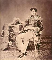 Keywords: Meiji Emperor.jpg other versions References Bennett Terry 'Early Japanese Images' Rutland Vermont Charles E Tuttle Company 1996 p 54; p 132 fig 128; p 144 fig 128 http //www cca qc ca/collectionenligne/fiches/fiches15 asp makeDiv false id 18588 ficheType 1 langue 2 Canadian Centre for Architecture; Collections Online s v Portrait of Meiji Ishii Ayako and Kotaro Iizawa 'Chronology' In 'The History of Japanese Photography' New Haven Connecticut Yale University Press 2003 314 Kinoshita Naoyuki 'The Early Years of Japanese Photography' In 'The History of Japanese Photography' New Haven Connecticut Yale University Press 2003 27-28 http //oldphoto lb nagasaki-u ac jp/unive/cgi-bin/cgispawn exe SPAWN searcher exe PROC_TYPE PROC_SHOW_DATA MOKUROKU_ID 3886 Nagasaki University Library; Japanese Old Photographs in Bakumatsu-Meiji Period Portrait of Emperor Meiji 3 cited 11 August 2003 Tucker Anne Wilkes et al 'The History of Japanese Photography' New Haven Connecticut Yale University Press 2003 p 54 pl 29 Worswick Clark The Disappearance of Uchida Kyuichi and the Discovery of Nineteenth-Century Asian Photography 'Image' vol 36 nos 1-2 Spring-Summer 1993 p 16 fig 1; p 30 fig 10 Worswick Clark 'Japan Photographs 1854-1905' New York Pennwick/Alfred A Knopf 1979 p 41 repr; pp 136 147 PD-Japan-oldphoto PD-US Uchida Kuichi Meiji Emperor 1873 portrait photographs 19th-century portrait photographs of sitting men at full length 1873 Armchairs in portrait photographs 1873 Court uniforms and dress of Japan Military uniforms of Japan Photographic Views of Japan with Historical and Descriptive Notes Portraits with swords 1873 Sitting with legs crossed ankle-on-ankle Tables in portrait photographs 1873 |