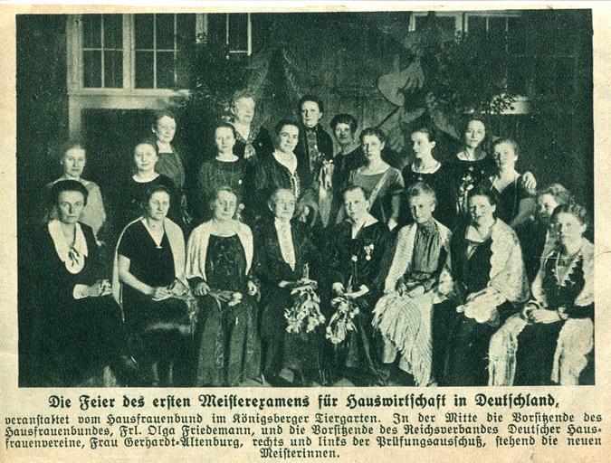 Keywords: Meisterinnen-Hauswirtschaft-1926.jpg en First examination of the Meisterin der Hauswirtschaft in Germany 1926 through the Königsberger Hausfrauenbund de 1914 wurde von Olga Friedemann und Helene Neumann der Königsberger Hausfrauenbund gegründet der den Beruf der Hauswirtschaftleiterin einführte Die für ganz Deutschland erste Prüfung zur staatlich anerkannten Meisterin der Hauswirtschaft fand 1926 in Königsberg statt Die Abbildung zeigt die Absolventen der Prüfung als Beweis für die geschichtlichen Grundlagen own work photo scan uploaded by user uploaded image out of the archive Franz Neumann-Stiftung; user is authorized see below 12 03 2016 The original of this image is situated in the Archive of the Franz Neumann-Stiftung as part of the Stiftung Königsberg where the user Neumann-Redlin von Meding Neumann-Meding is curator Königsberg Prussia Beruf Meisterin der Hauswirtschaft Berufsbildende Schule Königsberg Cc-zero |