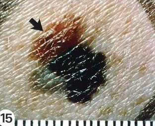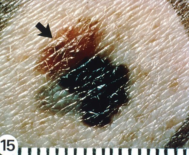 Keywords: Melanoma4.jpg Superficial spreading melanoma arising from a dysplastic nevus The 4-by-8-mm pink-tan lesion with irregular borders at the upper left arrow is a dysplastic nevus Arising from it is an invasive malignant melanoma with its characteristic blue-black color notched border and distorted surface The gray area at the lower left represents tumor regression <br> Topics/Categories Pathology -- Patient<br> Type Color Slide <br> Source National Cancer Institute<br> Author Unknown photographer/artist <br> AV Number AV-8500-3699 <br> Date Created 1985 <br> Date Entered 1/1/2001 <br> Access Public http //visualsonline cancer gov/details cfm imageid 2181 PD PD-USGov Superficial spreading melanoma |