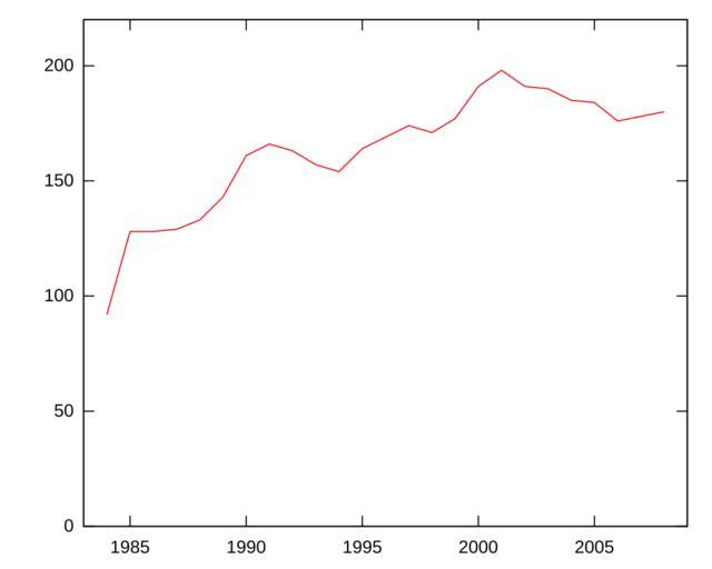 | Keywords: Membership in LDS Church in Iceland.svg Membership in The Church of Jesus Christ of Latter-day Saints in Iceland Kirkja Jesú Krists hinna síðari daga heilögu á Íslandi as a function of time Graph created in Gnuplot Data originates from Statistics Iceland as published online for the period of 1990 and later http //statice is/Statistics/Population/Religious-organizations and as published in the periodical Hagtíðindi for earlier years The data is as follows <pre> 1984 92 1985 128 1986 128 1987 129 1988 133 1989 143 1990 161 1991 166 1992 163 1993 157 1994 154 1995 164 1996 169 1997 174 1998 171 1999 177 2000 191 2001 198 2002 191 2003 190 2004 185 2005 184 2006 176 2007 178 2008 180 </pre> Graph created and uploaded on June 13 2009 Graph created by uploader in Gnuplot Religion in Iceland History of The Church of Jesus Christ of Latter-day Saints |