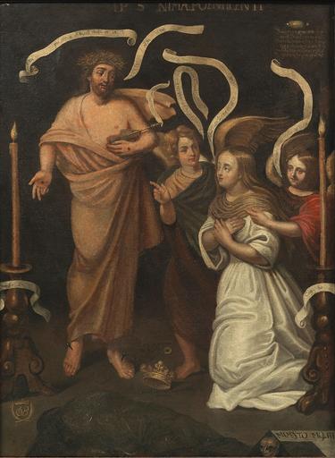 | Keywords: Memento mori D 18Jh CAB.jpg Memento mori; junge Frau in weißem Kleid die von zwei Engeln zu dem wiederauferstandenen Christus als Erlöser geleitet wird; links unten bekröntes ligiertes Stifter-Monogramm CAB Öl auf Leinwand 118 cm x 91 cm http //schloss-ahlden de/ Kunstauktionshaus Schloss Ahlden century 18 Anonymous Deutscher Maler des Barock 18 Jh wohl Hessen oder Franken PD-old-100-1923 Images from Kunstauktionshaus Schloss Ahlden Memento mori | ||||