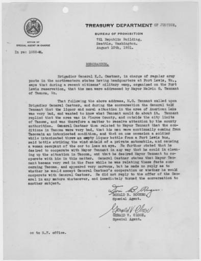 Keywords: Memo regarding conversation with Brigadier General K.C. Castner, commader at Fort Lewis, WA. - NARA - 298464.jpg Scope and content This document is part of a file detailing the events surrounding the investigation of the Tacoma Washington police department the Mayor of Tacoma and a number of city officials for Prohibition violations General notes 298464 Local identifier Department of Justice Bureau of Prohibition Seattle Office 1930 - 1934 NARA's Pacific Alaska Region Seattle NRIAS 6125 Sand Point Way NE Seattle WA 98115-7999 1931-08-10 Record group Record Group 56 General Records of the Department of the Treasury 1775 - 2005 Record group ARC 385 Investigative Case Files compiled 1924 - 1933 Series ARC 298428 File unit Tacoma Alcohol Seizure Investigation 1930 - 1934 File unit ARC 298447 Variant control numbers NAIL Control Number NRIS-56-PROHIB-1055M-MEMO4 Other versions <gallery> File Memo_regarding_conversation_with_Brigadier_General_K C _Castner _commader_at_Fort_Lewis _WA _-_NARA_-_298464 tif tif File Memo_regarding_conversation_with_Brigadier_General_K C _Castner _commader_at_Fort_Lewis _WA _-_NARA_-_298464 jpg jpg </gallery> NARA-cooperation PD-USGov Documents in English Brigadier generals Fort Lewis Tacoma Washington Prohibition in the United States 1931 in the United States |