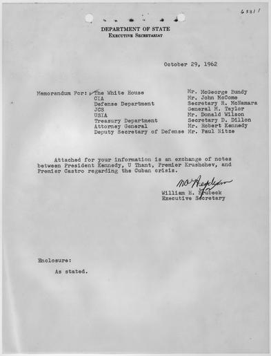 | Keywords: Memorandum for the White House other agencies and personell, October 29, 1962 - NARA - 193305.tif  Scope and content Cover memo sent with copies of exchanges between John F Kennedy Nikita Khrushchev U Thant and Fidel Castro during the Cuban Missile Crisis General notes 193305 Local identifier President 1961-1963 Kennedy Office of the Special Assistant to the President for National Security Affairs 01/20/1961 - 11/22/1963 NARA-Author Brubeck William H William Hurst 1920- Author 1699168 <br /> John F Kennedy Library NLJFK Columbia Point Boston MA 02125-3398 1962-10-29 Record group Collection JFK-NSF Papers of President Kennedy National Security Files 01/20/1961 - 11/22/1963 Record group ARC 1164 Papers of President Kennedy National Security Files Countries compiled 01/20/1961 - 11/22/1963 Series ARC 193236 File unit Papers of President Kennedy National Security Files Countries Cuba Subjects Composite of Exchange of Correspondence Between President and Khrushchev U Thant and Castro through 10/28/62 10/16/1962 - 10/28/1962 File unit ARC 193304 Variant control numbers NAIL Control Number NLK-NSF-CNTRYS-KKUTCCORMC-DOSMEMOWH yes Other versions NARA-cooperation PD-USGov Cuban Missile Crisis |