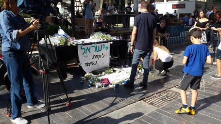 Keywords: Memorial for Sarona attack 2016.jpg Uploaded with en wp UW marker 2016 06 09 A makeshift monument for the en June 2016 Tel Aviv shooting own 9 June 2016 Bolter21 cc-zero Copyrighted free use Sarona Compound