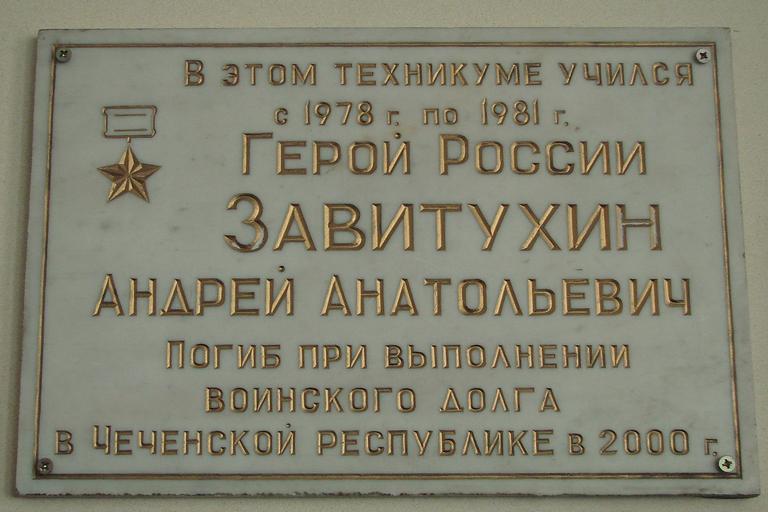 | Keywords: Memorial plaque Zavituhin 4.jpg en Russia Vologda Vologda Rail College memorial plaque in honor of Hero of Russia - Zavituhin Andrey ru Россия Вологда Вологодский техникум железнодо ожного т анспо та Памятная табличка в честь Ге оя России - Завитухина Анд ея Анатольевича Own Sergeev Pavel 2010 Plaques in Vologda Andrey Zavituhin |