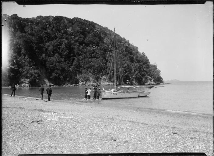 | Keywords: blackandwhite monochrome outdoor photo border black and white View of men boarding a yacht (AK 348) from the bow end. The yacht is close to shore at the north end of Cowes Bay. Three other men are standing nearby watching. Photographed by William Archer Price in early 1900s. Inscriptions: Inscribed - Photographer's title on negative -bottom left: Cowes Bay. Waiheke. Auckland. No 1860. Quantity: 1 b&w original negative(s). Physical Description: Dry plate glass negative 4.5 x 6.5 inches Men boarding a yacht, Cowes Bay, Waiheke Island. Price, William Archer, 1866-1948 :Collection of post card negatives. Ref: 1/2-000443-G. Alexander Turnbull Library, Wellington, New Zealand. natlib.govt.nz/records/22431533 View of men boarding a yacht (AK 348) from the bow end. The yacht is close to shore at the north end of Cowes Bay. Three other men are standing nearby watching. Photographed by William Archer Price in early 1900s. Inscriptions: Inscribed - Photographer's title on negative -bottom left: Cowes Bay. Waiheke. Auckland. No 1860. Quantity: 1 b&w original negative(s). Physical Description: Dry plate glass negative 4.5 x 6.5 inches Men boarding a yacht, Cowes Bay, Waiheke Island. Price, William Archer, 1866-1948 :Collection of post card negatives. Ref: 1/2-000443-G. Alexander Turnbull Library, Wellington, New Zealand. natlib.govt.nz/records/22431533 |