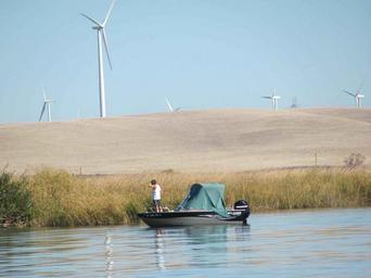 View Original:Men in boat in river with wind farm in background.jpg (2048x1536)