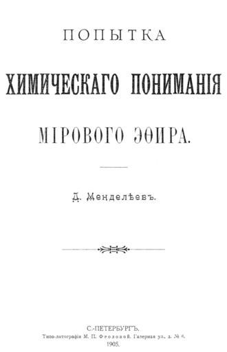 Keywords: Mendeleev Ether Cover 1905.png ru Обложка книги Химическое понимание ми ового эфи а 1905 http //ether-wind narod ru/Mendeleev_1905/ енделеев Д И File Mendeleev An attempt towards a chemical Conception of the Ether 1904 jpg PD-Art Uploaded with UploadWizard Literary works by Dmitri Mendeleev |