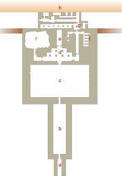 Keywords: Menkaure mortuary temple after siliotti.svg en Schematic diagram of Menkaure's mortuary temple after Siliotti's Guida alle piramidi d'Egitto a - causeway; b - long foreroom; c - courtyard; d pillared hall; e - sanctuary with scultpure or/and a false door; f - storerooms reconstruction is nearly impossibile on the left side ; g - antichambre carrée; h - the pyramid This diagram is not proportional hu Menkauré halotti templomának sematikus vázlata Siliotti Egyiptomi piramisok című könyve nyomán a - feljáróút b - hosszú előcsarnok c - udvar d - oszlopcsarnok e - szentély a király szobrával és/vagy álajtajával f - tárolóhelyiségek g - egyoszlopos szoba az antichambre carrée h - a piramis Az ábra nem méretarányos own HoremWeb 2009-06-20 Mortuary Temple of Menkaura Floor plans of ancient Egyptian temples |