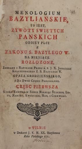 | Keywords: Menologium bazylianskie.jpg  en Title page of the book Ignacy Kulczynski Menologium bazylianskie Wilno 1771 be Тытульны а куш кнігі Ігнацій Кульчынскі Базыльянскі міналогій Вільня 1771 авто ская  абота Козуля Се гей Вікто овіч 29 12 2015 г файл п інадлежит мне как авто у нет Бела усь Г одно Бо соглебская Коложская це ковь Г одно Cc-zero  |