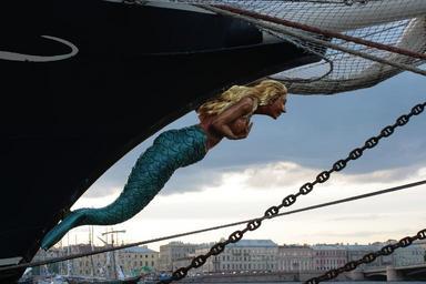 Keywords: mermaid on the bow evening gloomy sky grey sky stormy sky the sun behind the cloud