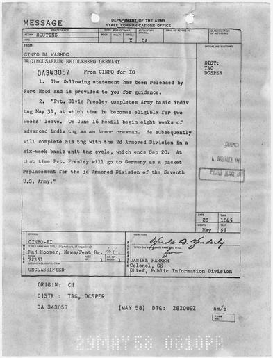 | Keywords: Message from U.S. Army, Public Information Division, releasing information about Private Elvis Presley's basic and... - NARA - 299789.tif Scope and content General notes 299789 Local identifier Department of Defense Department of the Army U S Total Army Personnel Command 12/08/1988 - 10/01/2003 NARA's National Personnel Records Center Military Personnel Records NRPM 9700 Page Avenue St Louis MO 63132-5100 date 1958 05 28 - 1958 05 28 Record group Record Group 319 Records of the Army Staff 1903 - 2009 Record group ARC 633 Official Military Personnel Files compiled 1912 - 1998 Series ARC 299741 File unit Official Military Personnel File of Elvis A Presley ca 1958 - ca 1960 File unit ARC 299786 Variant control numbers NAIL Control Number NRPM-319-OMPF-PRESLEYEA-CINFOMESSAGE yes Other versions <gallery> File Message_from_U S _Army _Public_Information_Division _releasing_information_about_Private_Elvis_Presley's_basic_and _-_NARA_-_299789 tif tif File Message_from_U S _Army _Public_Information_Division _releasing_information_about_Private_Elvis_Presley's_basic_and _-_NARA_-_299789 jpg jpg </gallery> NARA-cooperation PD-USGov Elvis Presley NARA TIF images with categorized JPGs |