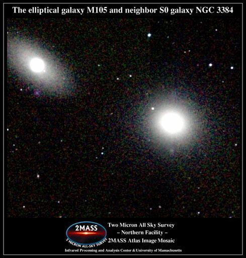 | Keywords: Messier 105 2MASS.jpg The elliptical galaxy Messier 105 and neighbor S0 galaxy NGC 3384 http //www ipac caltech edu/2mass/gallery/messiercat html 2MASS Atlas Image Gallery The Messier Catalog Two Micron All Sky Survey 2MASS a joint project of the University of Massachusetts and the Infrared Processing and Analysis Center/California Institute of Technology funded by the National Aeronautics and Space Administration and the National Science Foundation 2MASS Atlas image Messier 105 NGC 3384 2MASS Atlas Image Gallery The Messier Catalog BIG SIZE ImageNote 1 380 234 260 251 729 763 2 Messier 105 ImageNoteEnd 1 ImageNote 2 9 78 232 252 729 763 2 NGC 3384 ImageNoteEnd 2 |