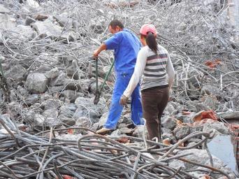 Keywords: Metal rebar reclamation for recycling at building demolition site - 03.jpg en Workers extracting rebar and other metal from concrete rubble at building demolition site Haikou City Hainan Province China 2012-04-27 own Anna Frodesiak cc-zero Uploaded with UploadWizard Rebar Files by User Anna Frodesiak Rubble