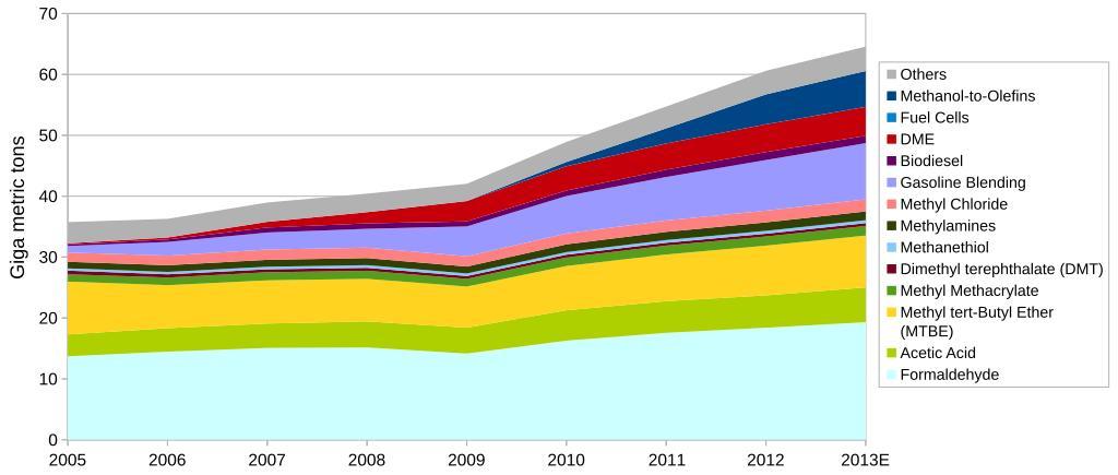 Keywords: Methanol-use.svg en Global use of methanol in giga metric tons plotted by final product 2005 till 2013 estimated Table of data used Demand 2005 2006 2007 2008 2009 2010 2011 2012 2013E; Formaldehyde 13 714 14 481 15 086 15 16 14 163 16 284 17 569 18 41 19 316; Acetic Acid 3 588 3 849 4 003 4 278 4 244 4 986 5 189 5 307 5 704; Methyl tert-Butyl Ether MTBE 8 671 7 056 7 094 6 985 6 749 7 265 7 673 8 169 8 521; Methyl Methacrylate 1 201 1 249 1 329 1 328 1 261 1 41 1 462 1 507 1 579; Dimethyl terephthalate DMT 0 603 0 537 0 488 0 487 0 467 0 453 0 457 0 458 0 468; Methanethiol 0 373 0 394 0 416 0 432 0 425 0 42 0 444 0 461 0 478; Methylamines 1 065 1 099 1 14 1 167 1 132 1 28 1 36 1 401 1 441; Methyl Chloride 1 525 1 572 1 686 1 713 1 691 1 782 1 857 1 916 1 987; Gasoline Blending 1 075 2 244 2 799 3 091 4 903 6 158 7 143 8 311 9 224; Biodiesel 0 264 0 41 0 817 0 909 0 832 0 903 1 21 1 314 1 218; DME 0 176 0 327 0 932 1 824 3 338 3 977 4 297 4 557 4 734; Fuel Cells 0 005 0 005 0 007 0 01 0 005 0 006 0 006 0 007 0 007; Methanol-to-Olefins 0 0 003 0 005 0 007 0 007 0 702 2 479 4 908 5 886; Others 3 499 3 059 3 169 3 038 2 824 3 307 3 584 3 872 4 014; data from http //www methanol org/pdf/WorldMeOHDemandbyDerivative pdf and http //www methanol org/getattachment/827c8c64-fb2a-4520-aa5a-210612b903cd/MMSA-Supply---Demand-Tables-2008---2013 pdf aspx own Wikiinger <span class signature-talk ></span> 11 14 9 September 2014 UTC 2014-09 Inkscape Line charts Methanol Cc-zero |