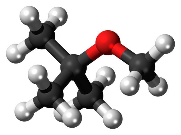 Keywords: Methyl tert-butyl ether 3D ball.png Ball-and-stick model of the methyl tert-butyl ether molecule also known as MTBE an ether used as a solvent Colour code 505050 Carbon C black<br> F0F0F0 Hydrogen H white<br> F51E1E Oxygen O red<br> 2011-07-03 own DS Visualizer Jynto talk Space-filling version cc-zero Images by Jynto MTBE |