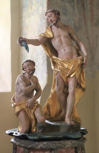 Keywords: Metnitz - Pfarrkirche - Taufstein1.JPG Denkmalgeschütztes Objekt Österreich 62520 Metnitz Pfarrkirche in Metnitz own Raul de Chissota 2011-07-12 PD St Leonhard in Metnitz - Skulpturen Sculptures of Baptism of Christ in Carinthia