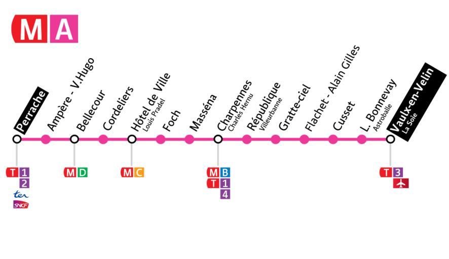 Keywords: Metro Lyon MA-plan.svg fr Plan schématique de la ligne A du métro de Lyon own Antwan 2011-08-22 cc-by-3 0 Public transport maps of Lyon Lyon Metro Ligne A