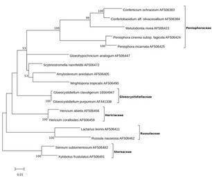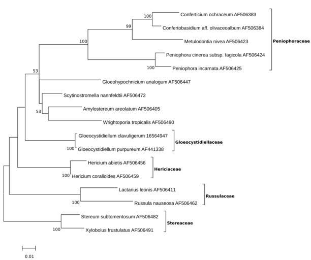 | Keywords: Metulodontia-Maximum-Likelihood.svg  Figure Molecular Phylogenetic analysis of Metulodontia by the Maximum Likelihood method<br/> The evolutionary history was inferred by using the Maximum Likelihood method based on the Kimura 2-parameter model 1 The tree with the highest log likelihood -5311 8139 is shown The percentage of trees in which the associated taxa clustered together is shown next to the branches Initial tree s for the heuristic search were obtained by applying the Neighbor-Joining method to a matrix of pairwise distances estimated using the Maximum Composite Likelihood MCL approach A discrete Gamma distribution was used to model evolutionary rate differences among sites 5 categories +G parameter 0 4787 The rate variation model allowed for some sites to be evolutionarily invariable +I 56 3336 sites The tree is drawn to scale with branch lengths measured in the number of substitutions per site The analysis involved 17 nucleotide sequences All positions with less than 95 site coverage were eliminated That is fewer than 5 alignment gaps missing data and ambiguous bases were allowed at any position There were a total of 1379 positions in the final dataset Evolutionary analyses were conducted in http //megasoftware net/ MEGA6 2<br/> 1 Kimura M 1980 A simple method for estimating evolutionary rate of base substitutions through comparative studies of nucleotide sequences Journal of Molecular Evolution 16 111-120 <br/> 2 Tamura K Stecher G Peterson D Filipski A and Kumar S 2013 MEGA6 Molecular Evolutionary Genetics Analysis version 6 0 Molecular Biology and Evolution30 2725-2729 <br/> ; List of GenBank Sequences http //www ncbi nlm nih gov/nuccore/AF506425 Peniophora incarnata AF506425 http //www ncbi nlm nih gov/nuccore/AF506424 Peniophora cinerea subsp fagicola AF506424 http //www ncbi nlm nih gov/nuccore/AF506405 Amylostereum areolatum AF506405 http //www ncbi nlm nih gov/nuccore/AF506383 Conferticium ochraceum AF506383 http //www ncbi nlm nih gov/nuccore/AF506384 Confertobasidium aff olivaceoalbum AF506384 http //www ncbi nlm nih gov/nuccore/16564947 Gloeocystidiellum clavuligerum 16564947 http //www ncbi nlm nih gov/nuccore/AF441338 Gloeocystidiellum purpureum AF441338 http //www ncbi nlm nih gov/nuccore/AF506447 Gloeohypochnicium analogum AF506447 http //www ncbi nlm nih gov/nuccore/AF506456 Hericium abietis AF506456 http //www ncbi nlm nih gov/nuccore/AF506459 Hericium coralloides AF506459 http //www ncbi nlm nih gov/nuccore/AF506411 Lactarius leonis AF506411 http //www ncbi nlm nih gov/nuccore/AF506423 Metulodontia nivea AF506423 http //www ncbi nlm nih gov/nuccore/AF506462 Russula nauseosa AF506462 http //www ncbi nlm nih gov/nuccore/AF506472 Scytinostromella nannfeldtii AF506472 http //www ncbi nlm nih gov/nuccore/AF506482 Stereum subtomentosum AF506482 http //www ncbi nlm nih gov/nuccore/AF506490 Wrightoporia tropicalis AF506490 http //www ncbi nlm nih gov/nuccore/AF506491 Xylobolus frustulatus AF506491 own 2014-09-09 Thkgk Cc-zero Metulodontia |