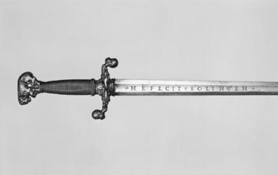 Keywords: Meves Berns - Light Sword for Civilian Use - Walters 511387.jpg This hilt is remarkable for its figural motifs the pommel is chiseled as a lion the quillons as Africans' heads and the finger guard with a mythical unicorn attacked by a hound Combined these symbolize the ferocity of a noble warrior who uses his weapon in a pure cause though beset by adversity The hilt is attributed to Gottfried Leygebe by comparison with ones that are signed It may replace an earlier one that was damaged The blade is signed MEVES BERNS on one side and on the other side ME FECIT SOLINGEN Meves Berns of Solingen made me ca 1650 steel iron; grip is restored cm 102 5 accession number 51 1387 13203 Private collection Sweden Sale Sotheby's London April 16 1973 lot 219 Walters Art Museum 1973 by purchase Museum purchase 1973 place of origin Solingen Germany Walters Art Museum license Weapons in the Walters Art Museum Baroque art in the Walters Art Museum Bladesmiths Economy of Solingen Swords of Germany Unicorns in sculptures Dogs in art Lions in decorative arts