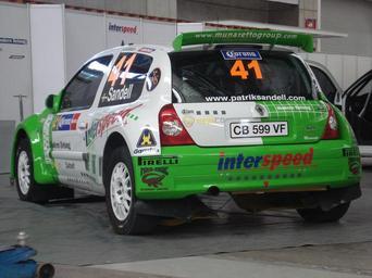 Keywords: MEX 2008 RB 41 parked 1.jpg Patrick Sandell's Renault Clio S1600 parked prior to the 2008 Rally Mexico at rally base in the Poliforum in Leon Mexico Own 2008-02-27 Joshbaumgartner 2008 Rally Mexico Patrik Sandell Renault Clio Super 1600