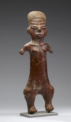 | Keywords: Mexican - Female Figure - Walters 20092052 - Three Quarter Right.jpg Large hollow figures epitomize the sculptural expertise of the earliest pottery artists in the central Mexican highlands Found in burials at sites in the Valley of Mexico such as Tlatilco and Tlapacoya and many others in the adjacent states of Morelos and Puebla these figures typically portray nude women Artists accentuate the hips and firm breasts while reducing the arms and feet to small simplified forms This corporeal focus has prompted some scholars to interpret them as fertility objects pertaining to female rites of passage or fecundity An alternative view sees the figures as representations of religious practitioners in the throes of shamanic trance This interpretation calls attention to the artistic accentuation of the head and the careful rendering of elaborate head wraps or coiffures Frequently too these figures' mouths are rendered slightly open and their eyes stare blankly into space These features recall renderings of shamanic trance throughout the Americas Both figures have scored ears which the Spanish observed among many Native priests in highland Mexico and Yucatan cut during blood-offering rituals that served both religious ideology and the achievement of a spiritual trance state between 1200 900 BC Early Formative earthenware burnished slip paint cm 50 7 18 9 8 2 accession number 2009 20 52 80207 John G Bourne 1950s by purchase in Cuernavaca Mexico Walters Art Museum Gift of John Bourne 2009 place of origin Puebla Mexico Walters Art Museum license Mexican Pre-Columbian art in the Walters Art Museum Art of Mexico Tlatilco ceramic figurines Media contributed by the Walters Art Museum needs category review Tlapacoya |