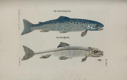 Keywords: Meyer Zeit-Vertreib 1 Tafel 044.jpg Angenehmer und nützlicher Zeit-Vertreib mit Betrachtung curioser Vorstellungen allerhand kriechender fliegender und schwimmender auf dem Land und im Wasser sich befindender und nährender Thiere sowohl nach ihrer Gestalt und äusserlichen Beschaffenheit als auch nach der accuratest davon verfertigten Structur ihrer Scelete oder Bein-Cörper nebst einer deutlichen so physicalisch und anatomisch besonders aber osteologisch und mechanischen Beschreibung derselben / nach der Natur gezeichnet gemahlet in Kupfer gestochen und verlegt von Johann Daniel Meyer Miniatur-Mahler in Nürnberg; Band 1; Nürnberg 1748<br /> Tafel 44 Forelle http //resolver sub uni-goettingen de/purl PPN624674746 1748 Creator Johann Daniel Meyer PD-old-100 Angenehmer und nützlicher Zeit-Vertreib 1 Meyer Salmo trutta Fish skeletons |