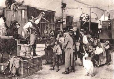 Keywords: Meyerheim.schlangenbändiger.jpg de Paul Friedrich Meyerheim Ein Mann präsentiert der Menge eine Schlange Fotogravur Heliogravüre nach einem Gemälde Meyerheims 1880er/1890er Jahre http //cgi ebay com my/CIRCUS-Tent-MAN-HOLDS-SNAKE-for-CROWD-1884-Art-Print_W0QQcmdZViewItemQQitemZ270310226321 ebayphotohosting Creator Paul Friedrich Meyerheim ca 1884 PD-Old Snake charmers in art People with animals in art Zoos in art Travelling menageries Paul Meyerheim 19th-century engravings |