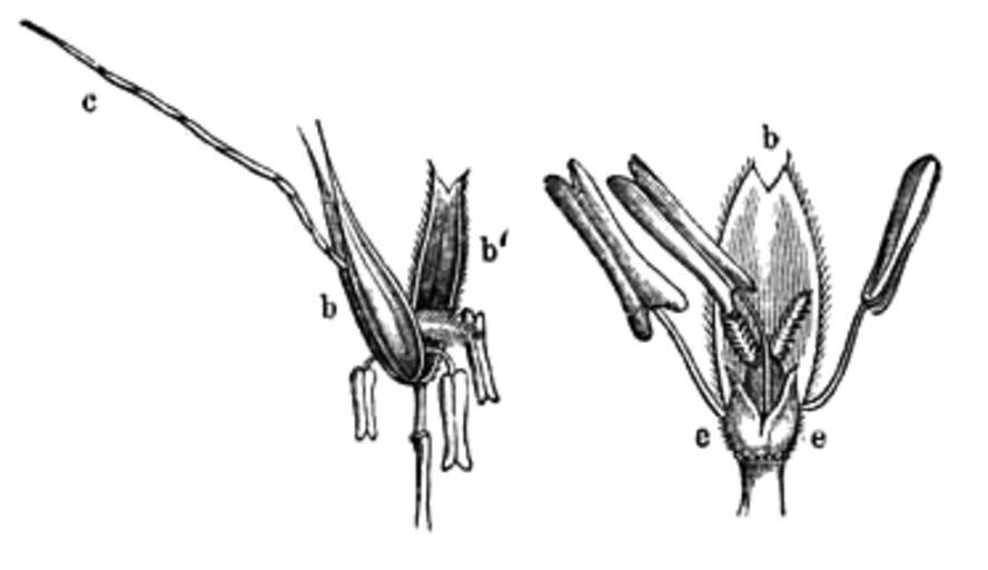 | Keywords: Meyers b3 s0066 b1.png de Grasblüte links bb ² Blütenspelzen c Granne rechts b Blütenspelze ee Blütenhülle Meyers b3 s0066 jpg ca 1885 author PD-Meyers Close-ups of Poaceae flowers 19th-century flower diagrams Images from Meyers Konversationslexikon 4th edition - text figures |