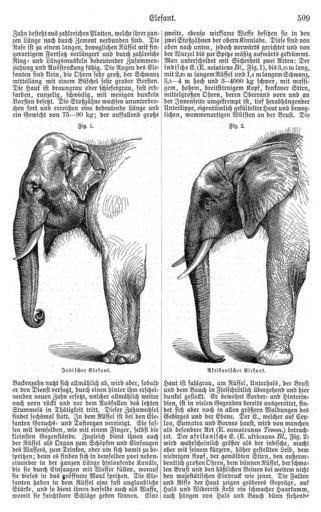 Keywords: Meyers b5 s0509.jpg Fig 1 Asian Elephant Fig 2 African Elephant Fig 1 Asiatischer Elefant Fig 2 Afrikanischer Elefant Meyers Konversationslexikon 1885-90 Bibliographisches Institut 5 0509 PD-old-70-1923 extract Engravings of elephants