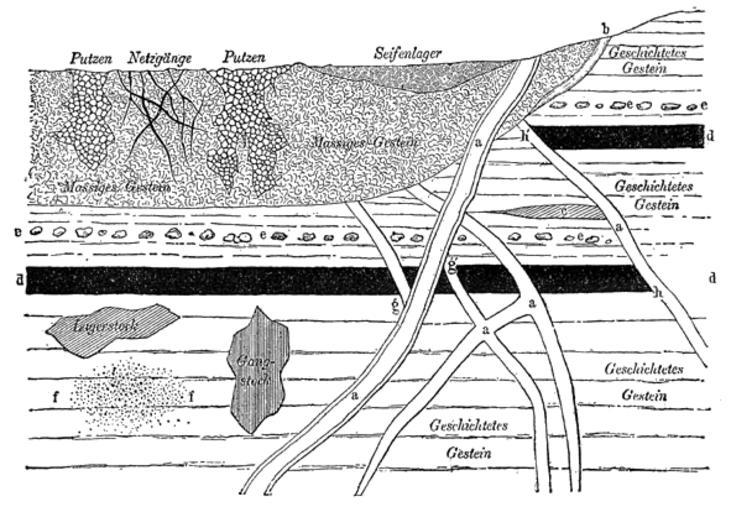 | Keywords: Meyers b5 s0838 b1.png de Schematische Darstellung von Erzlagerstätten a Gänge b Kontaktgang c Lagergang d Lager Flöz e Flöz f Imprägnationen gg ² Verwerfung eines Ganges hh ² Verwerfung eines Lagers Meyers b5 s0838 jpg ca 1885 author PD-Meyers Images from Meyers Konversationslexikon 4th edition - text figures Mining schemas and diagrams |